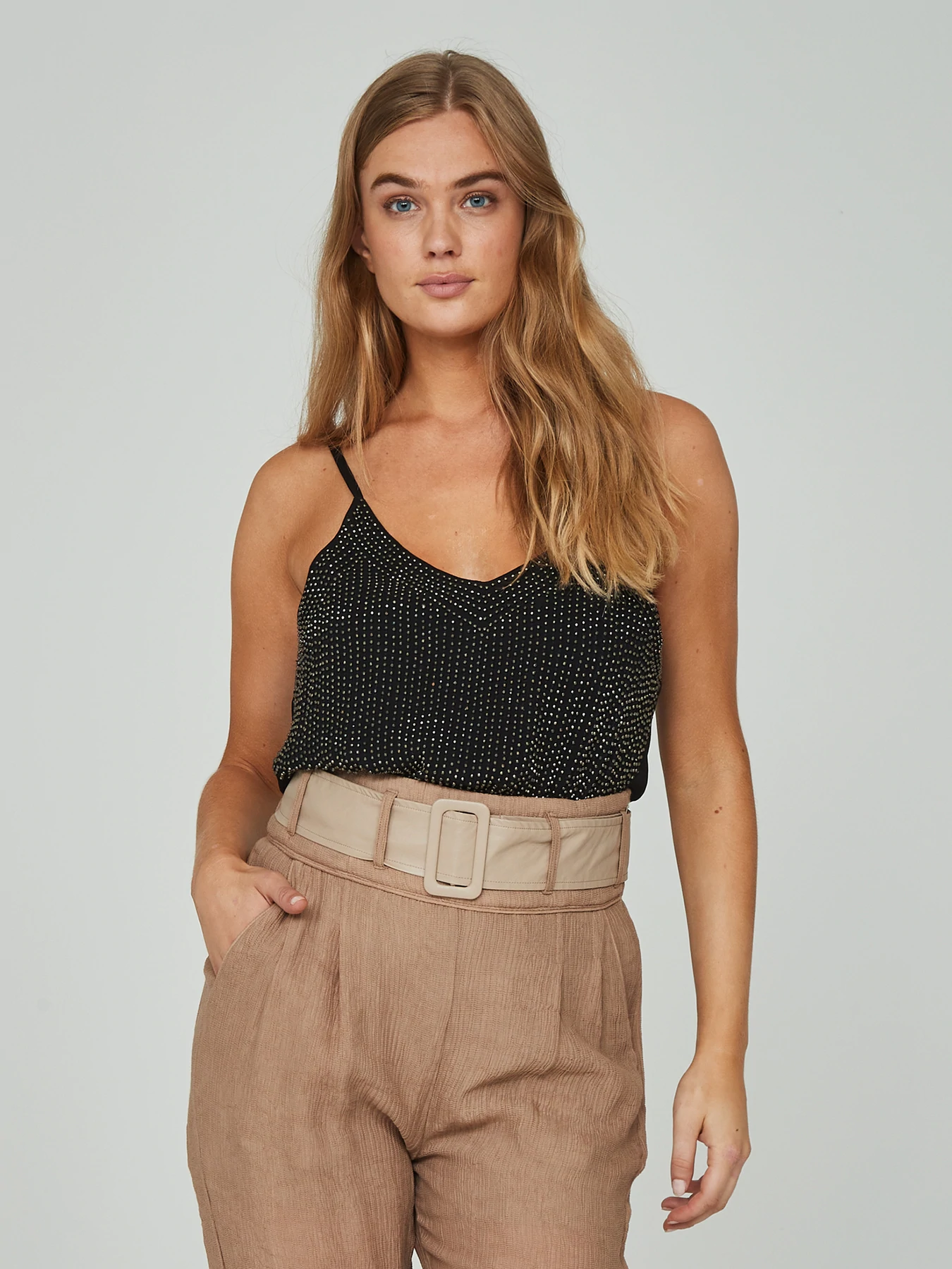 Precioso top confeccionado en un cómodo y transpirable tejido de viscosa. El top tiene un precioso escote en pico y tirantes finos y ajustables y está decorado con preciosas cuentas aplicadas a mano. Combina el top con los pantalones LUCI y un par de sandalias para un atuendo femenino y sofisticado, o combínalo con los pantalones blancos LARA para un look fresco y elegante.