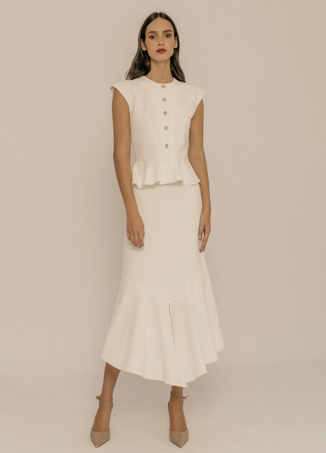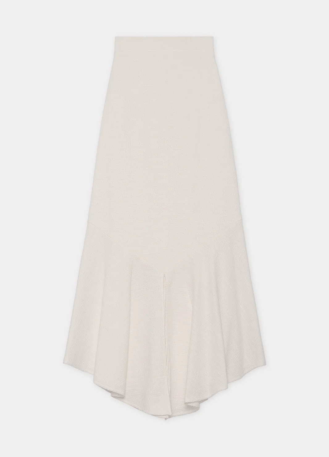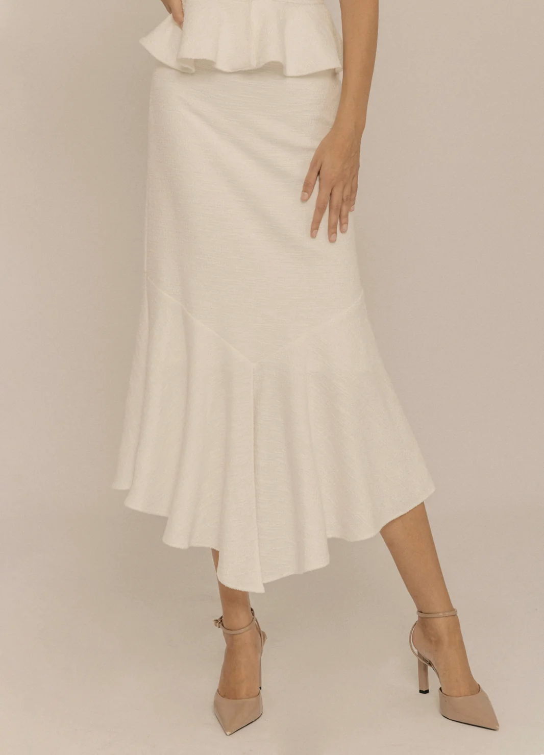 Falda midi de tiro alto, confeccionada en tejido de tweed. Su diseño incluye un volante evasé asimétrico con bajo en forma de pico y una abertura en la parte delantera. Cuenta con cinturilla y cierre de cremallera invisible en la parte trasera.