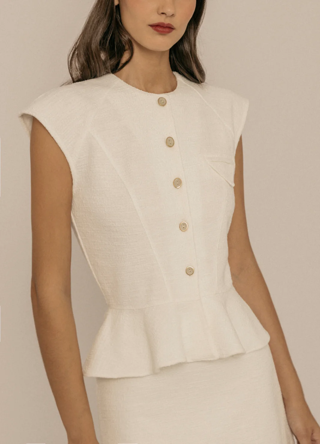 Top entallado tipo peplum con bajo asimétrico, confeccionado en tejido de tweed. Con manga raglán corta y corte en la cintura, este top presenta una abertura central en el delantero con cierre de botones de nácar con acabado dorado. Cuenta con un elegante detalle de tapeta