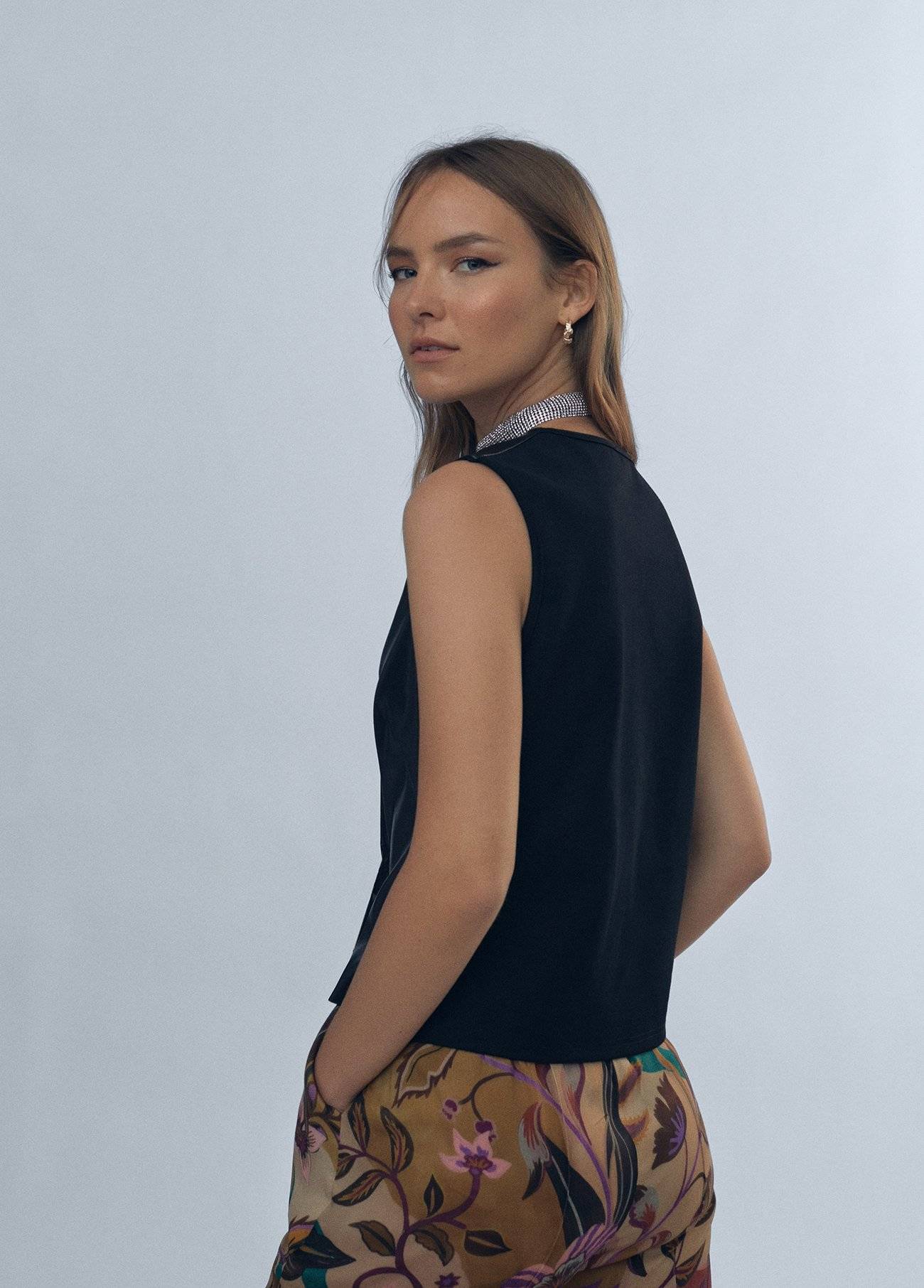 Top sin mangas de efecto piel. Detalle de tachuelas doradas en cuello pico y frontal.