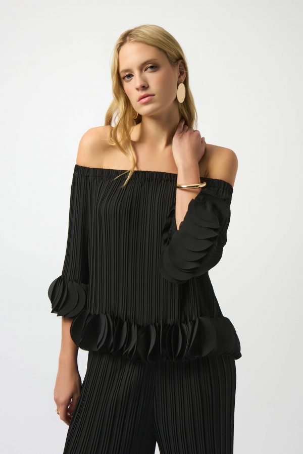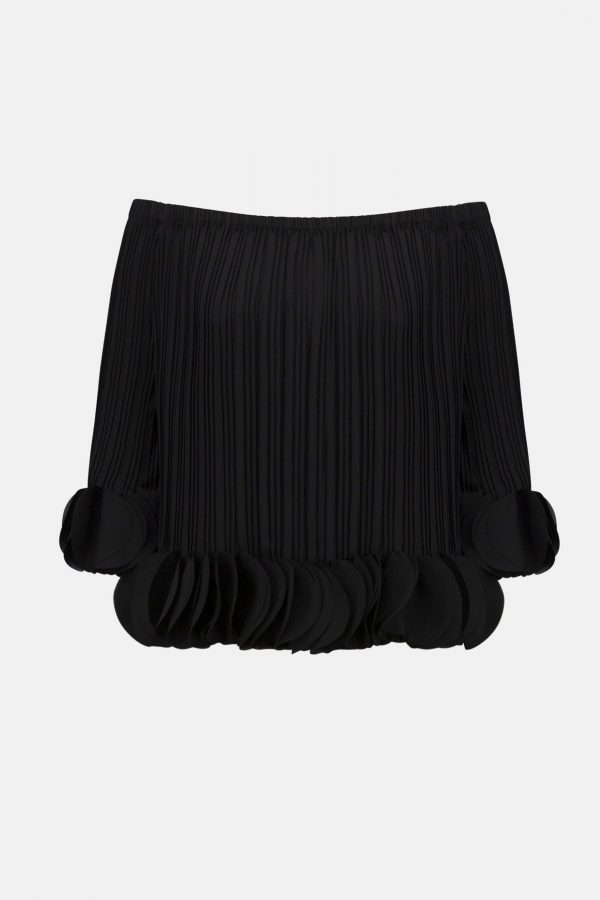 Realza tu estilo personal con este impresionante top de hombros descubiertos, diseñado para añadir un toque de encanto coqueto a tu armario. Confeccionado en georgette ligero y vaporoso, esta prenda fluida presenta elegantes mangas plisadas que le dan un toque sofisticado. Un distintivo aplique circular en el bajo le aporta un toque refrescante y moderno, convirtiéndolo en una opción destacada para cualquier ocasión.