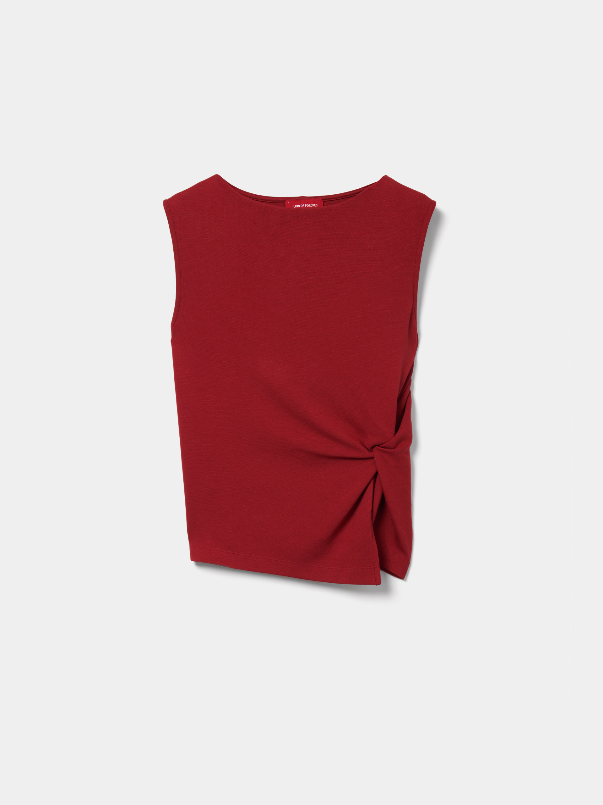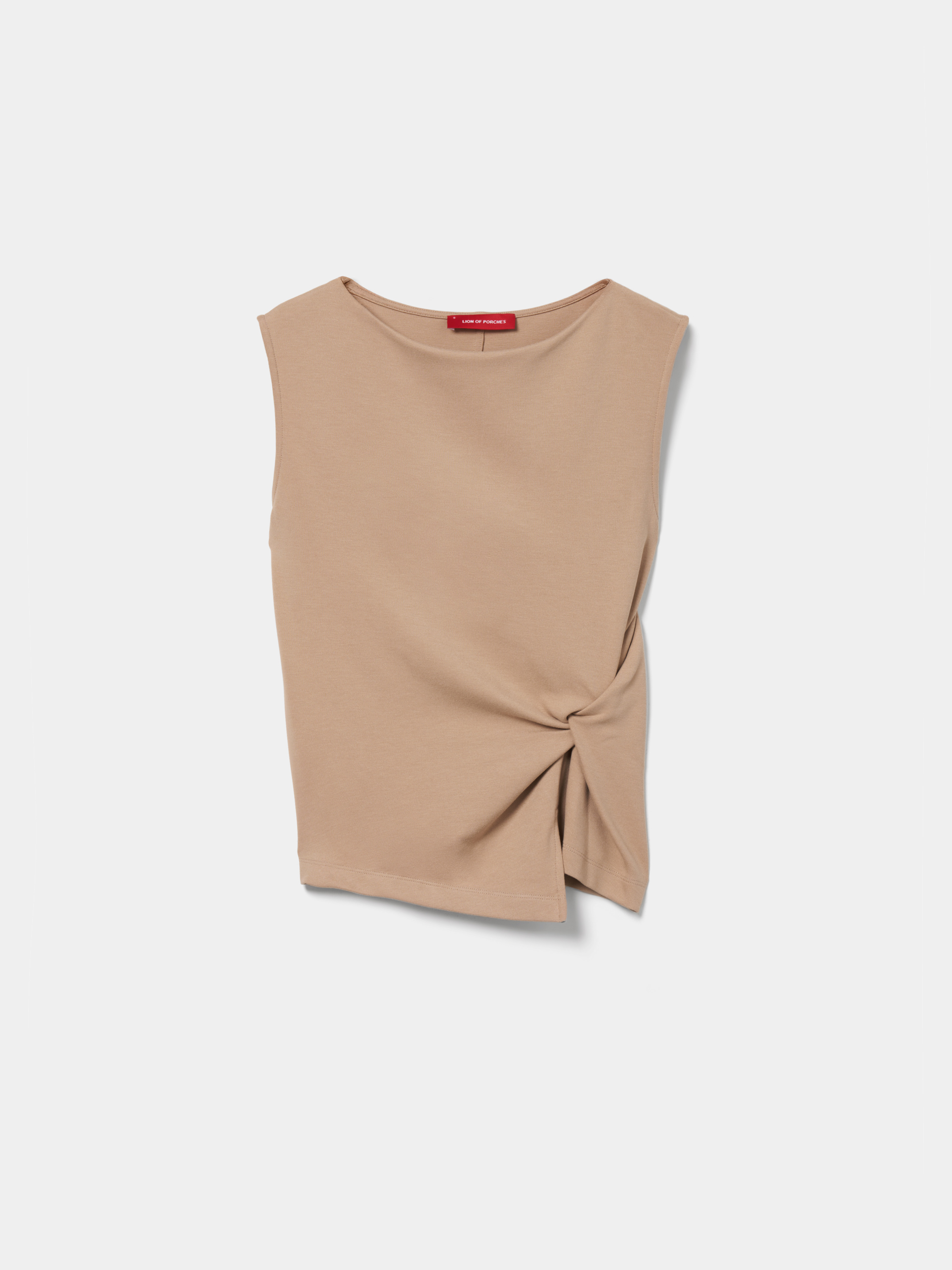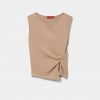 Top sin mangas con escote redondo. Su diseño destaca por el detalle del nudo decorativo en la cintura, que crea una caída sofisticada y moderna. Una prenda versátil y cómoda, ideal para completar un look veraniego.