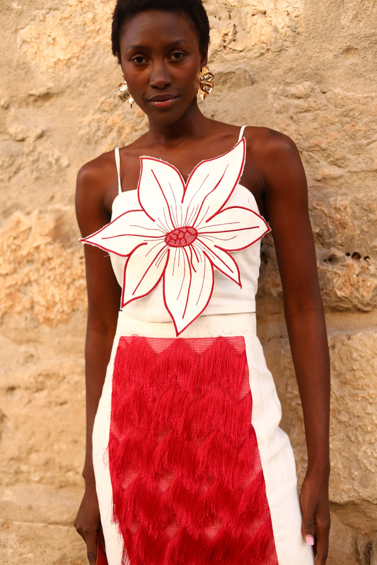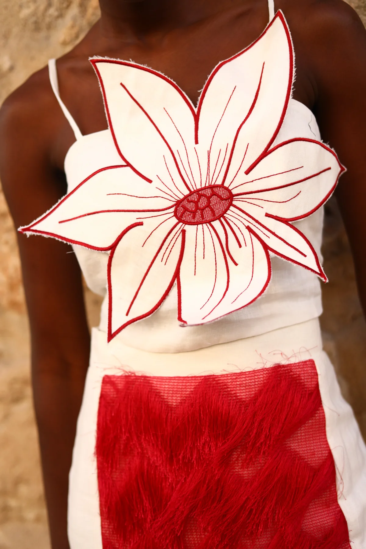 Top en tono marfil de lino, con tirantes finos y una espectacular flor tridimensional bordada al frente. Su espalda con elástico hace que se ajuste perfectamente al cuerpo. Ideal para destacar en ocasiones especiales.