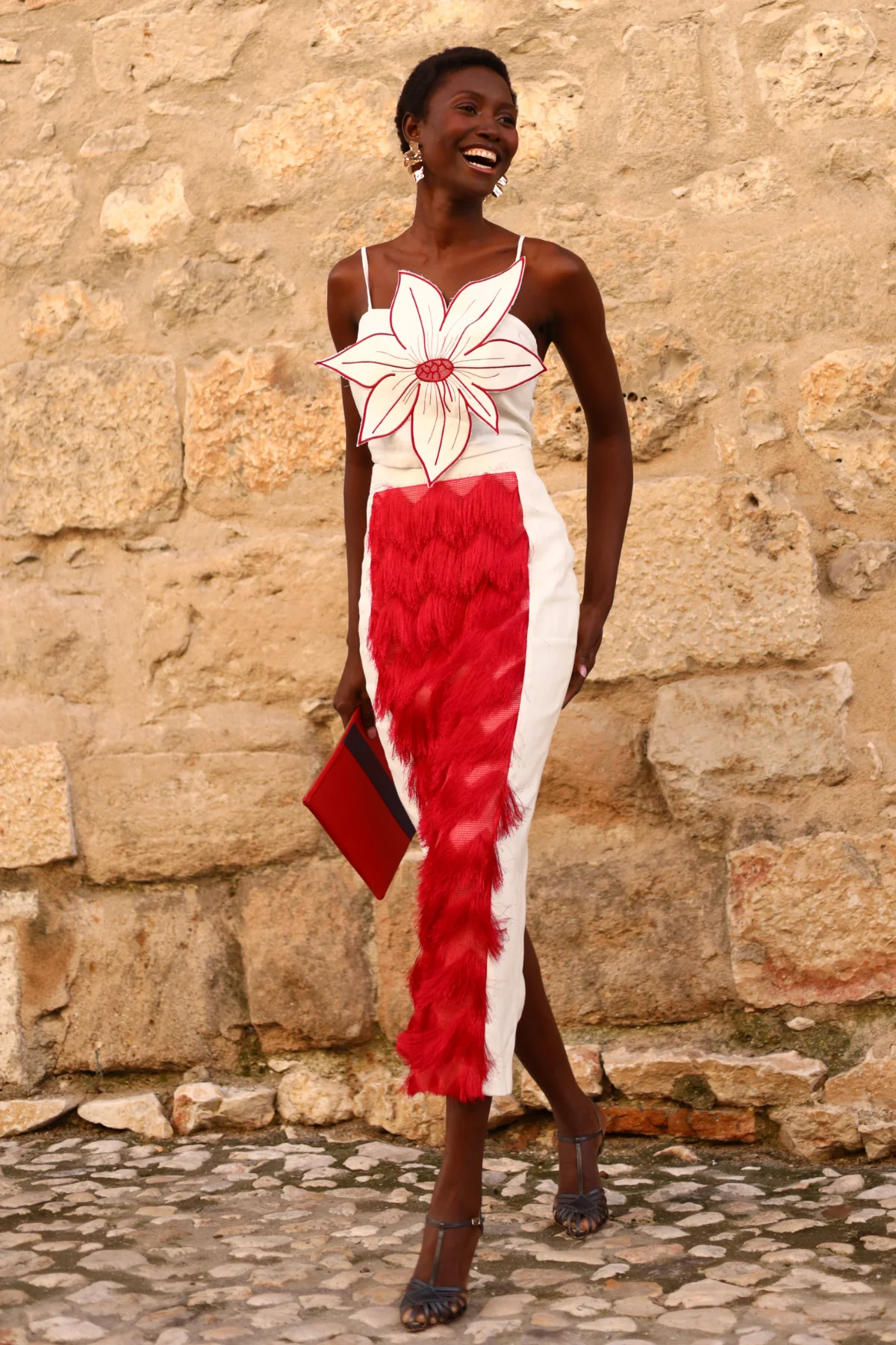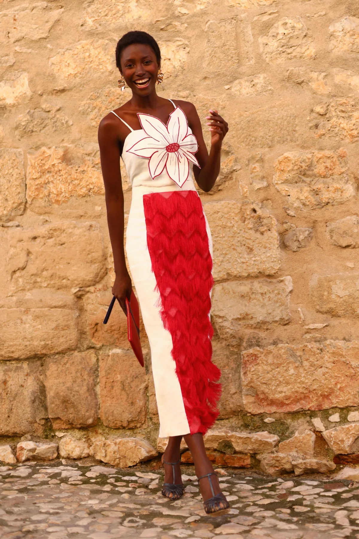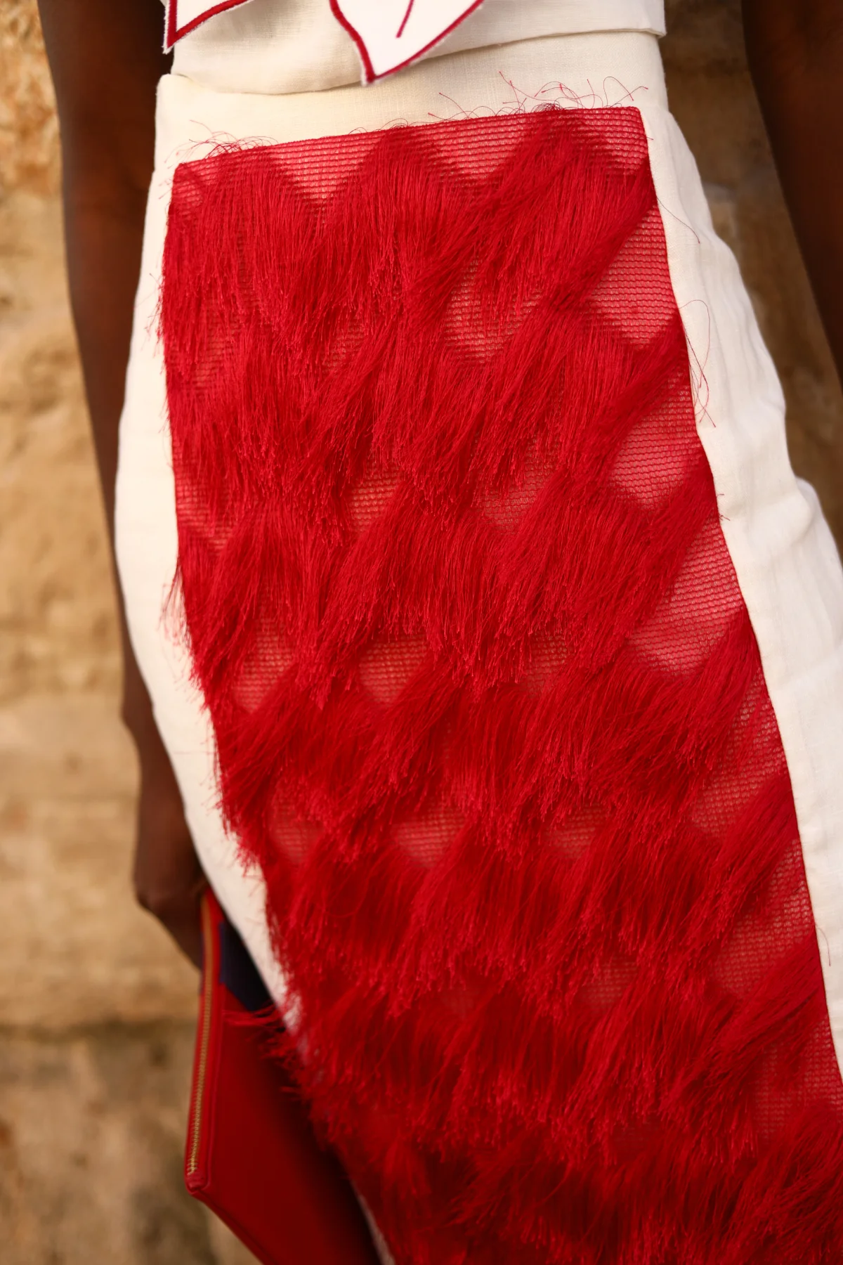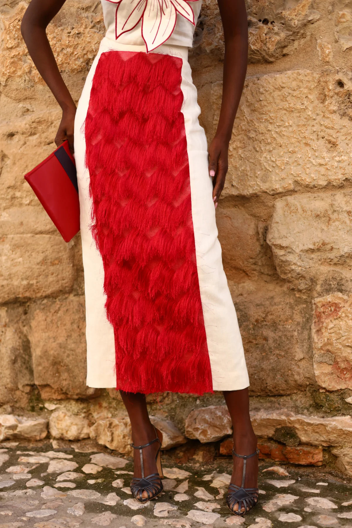 Falda midi de corte recto confeccionada en lino natural. Destaca por su panel central en coral con textura de flecos en relieve, que aporta dinamismo y sofisticación. El contraste de colores realza la silueta con un efecto estilizador.