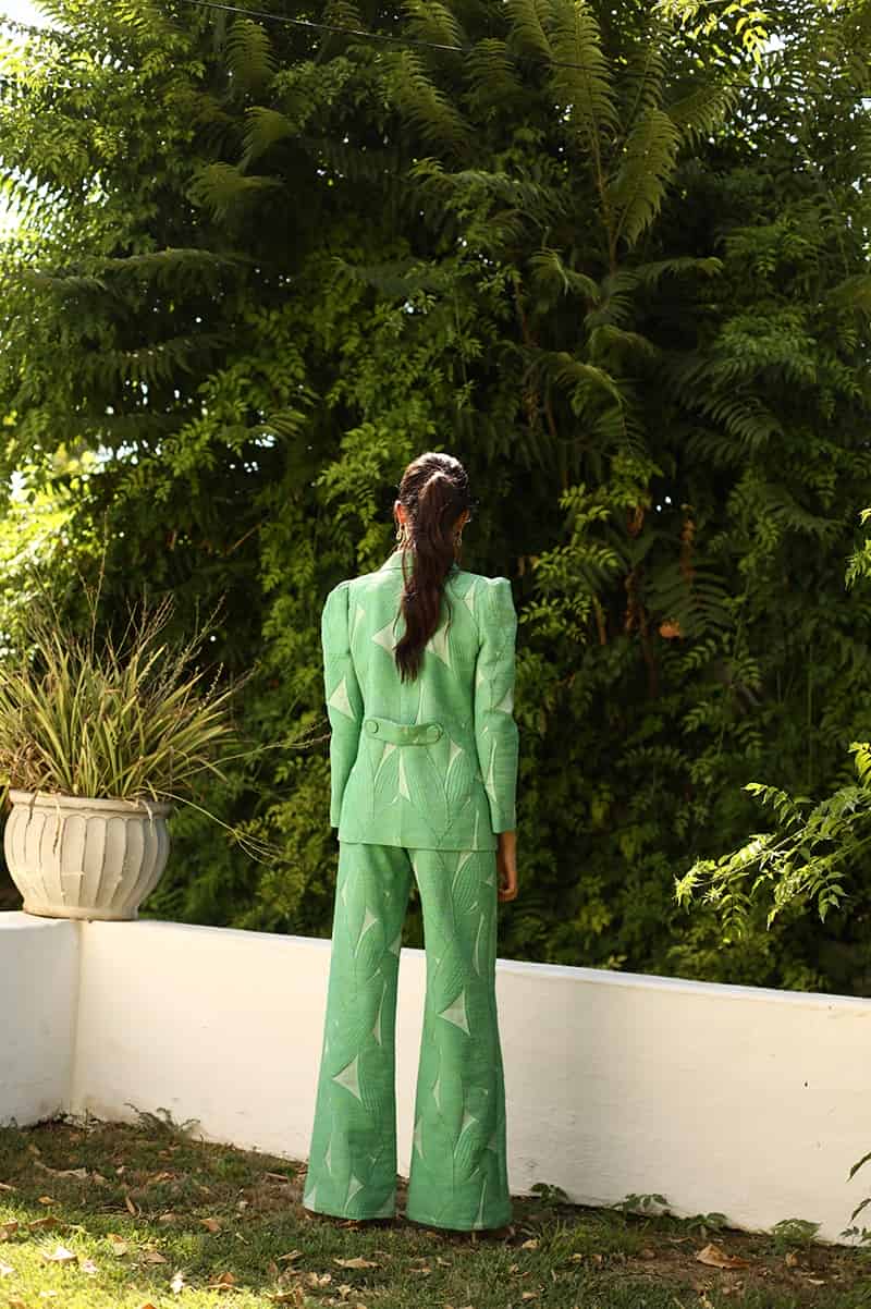 Traje de dos piezas compuesto por una americana cruzada de diseño estructurado y pantalón palazzo de tiro alto con cremallera invisible en la parte trasera.