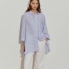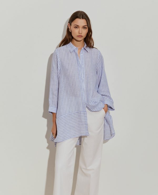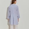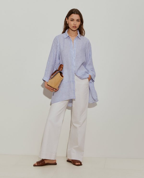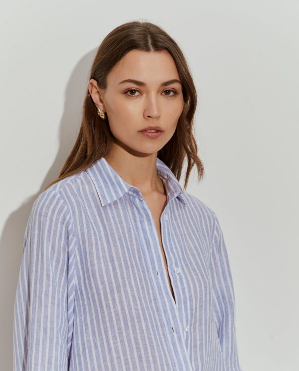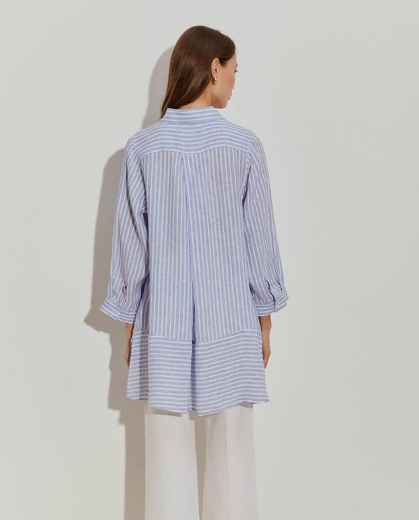 Camisa larga estilo túnica con estampado de rayas verticales. Manga larga y apertura con botones en la parte delantera. Está fabricado íntegramente en lino. Ligero, transpirable y naturalmente fresco, es un tejido elegido para la temporada de clima cálido.