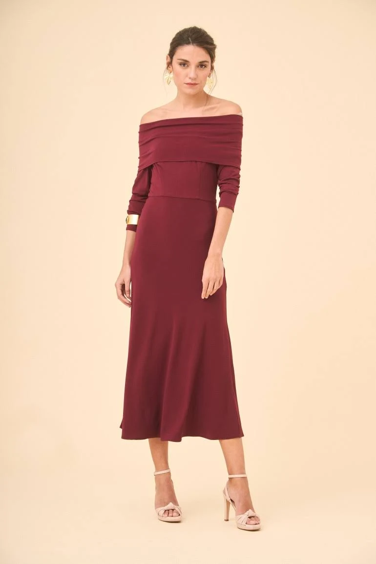 Vestido de fiesta midi confeccionado en tejido de punto color burdeos. Corte en la cintura y falda fluida. Escote palabra de honor con manga larga.