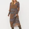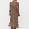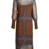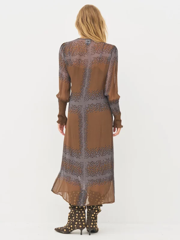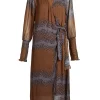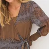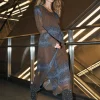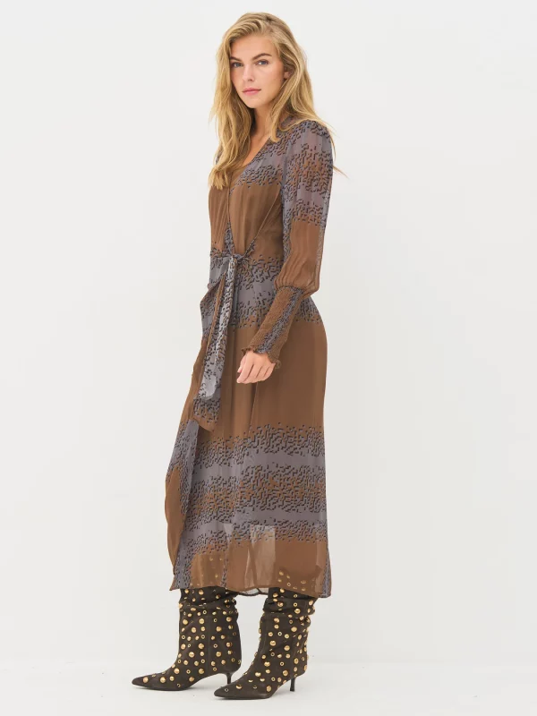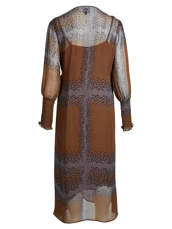 Este vestido combina ligereza y estructura con su delicado material transparente y su estampado gráfico. Presenta un efecto envolvente con un lazo en la cintura y mangas largas con fruncido y delicados volantes, que le aportan un toque femenino. La combinación incluida garantiza una cobertura cómoda.