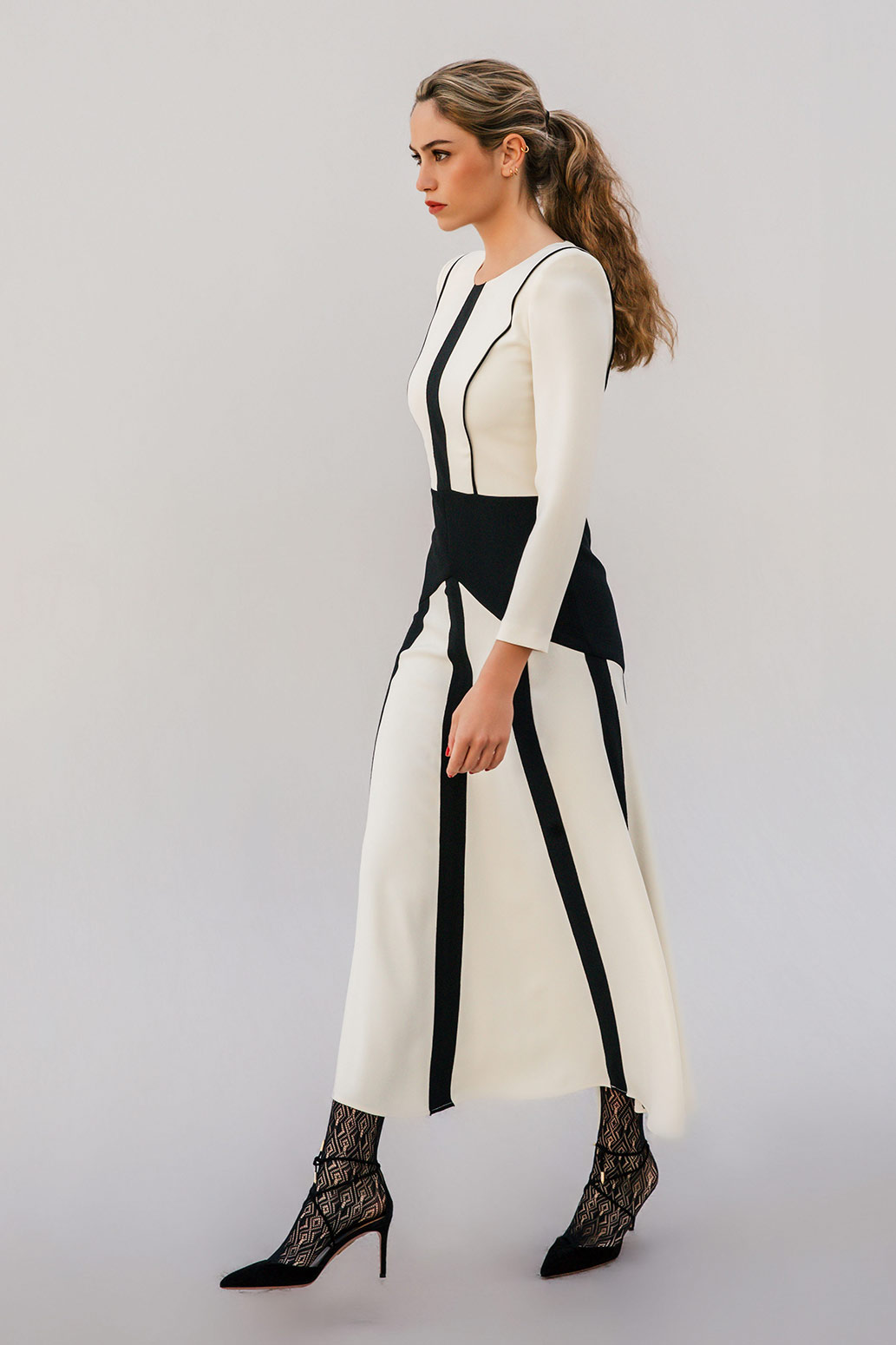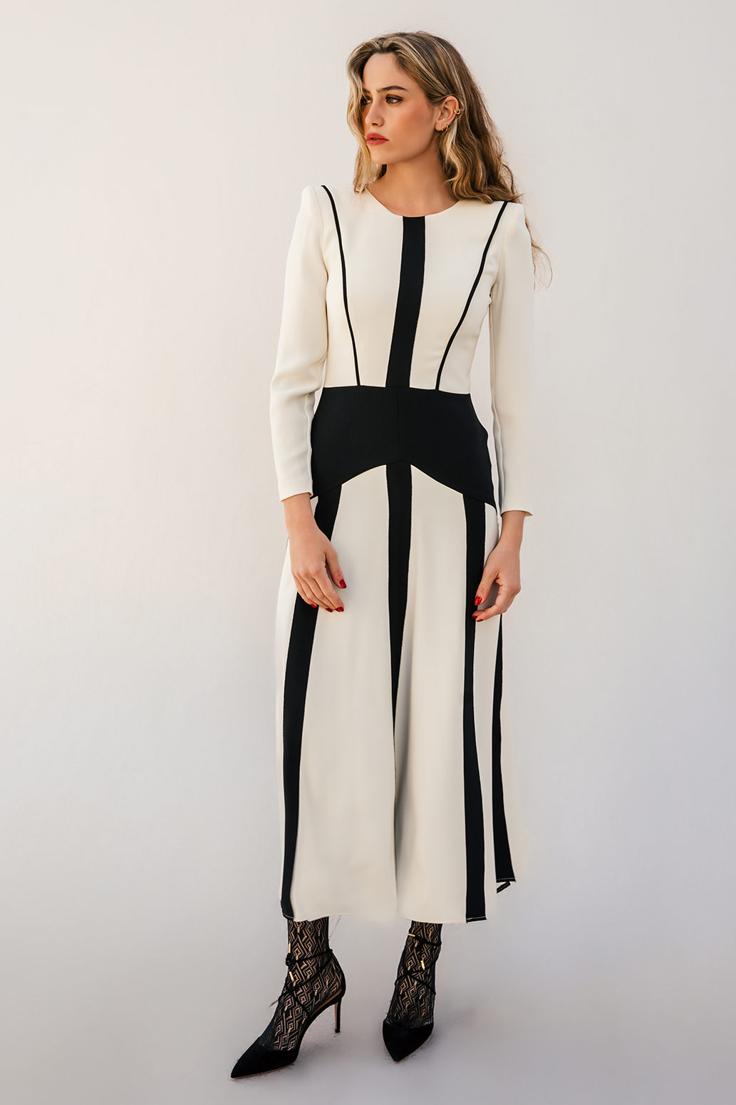 Vestido en crepe con manga larga cuello a la caja y contrastes. El vestido Calma, así como todas las prendas de Colour Nude, son diseñadas y confeccionadas en España.