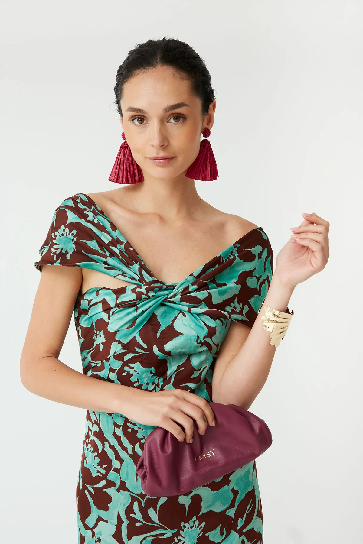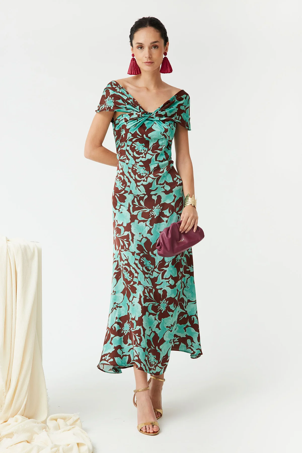 Deslumbra en cualquier evento con este vestido largo de estampado floral en tonos turquesa y chocolate, una pieza sofisticada y única de nuestra colección Coosy. Con escote drapeado tipo off shoulder y detalle anudado en el pecho, realza la figura con un diseño favorecedor y elegante.