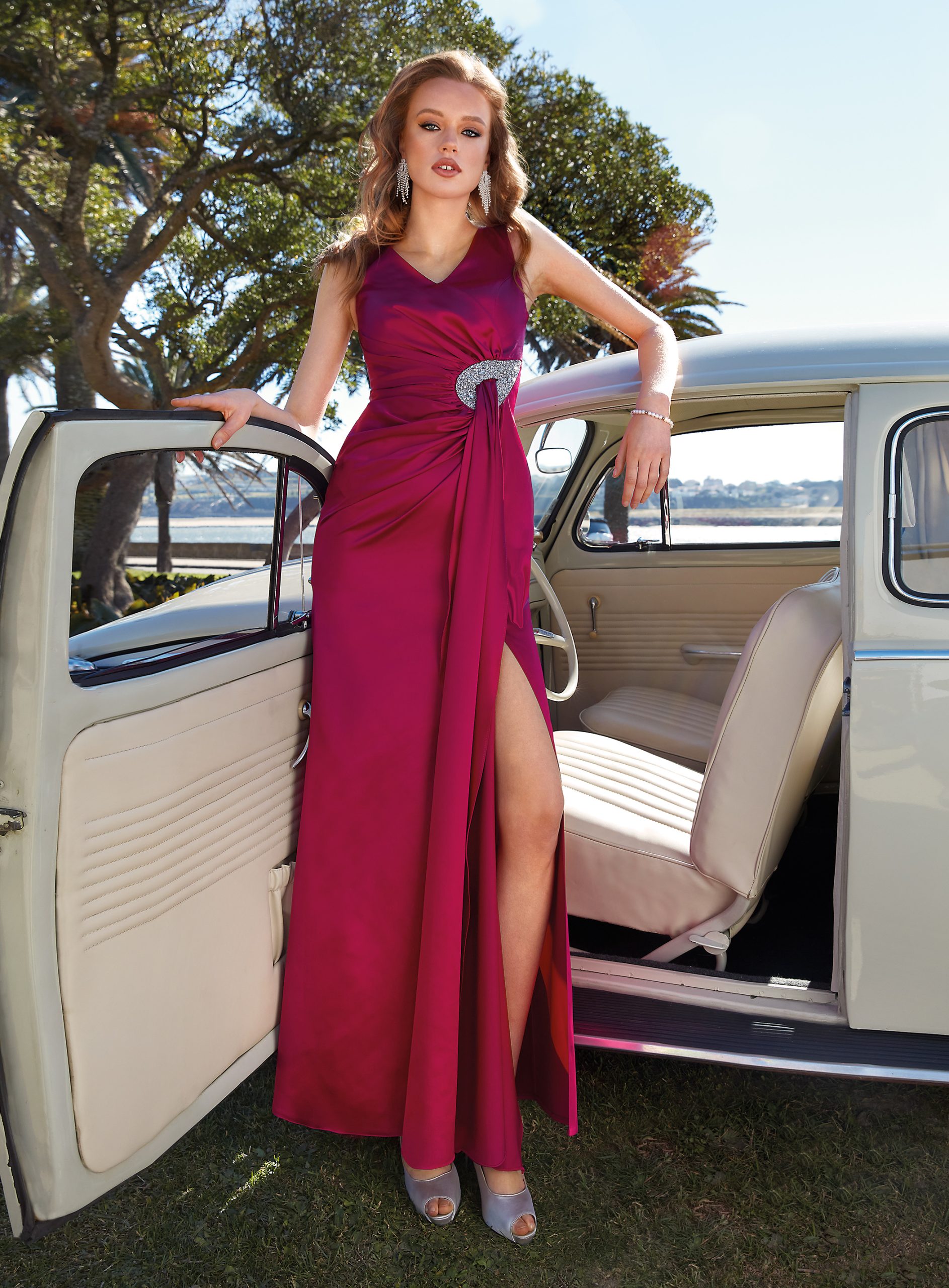 Vestido largo de ceremonia con broche joya en la cintura haciendo un recogido