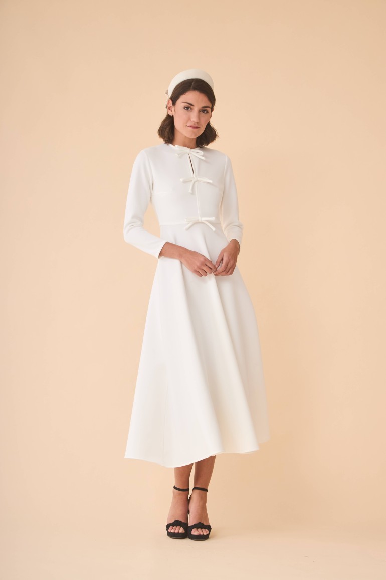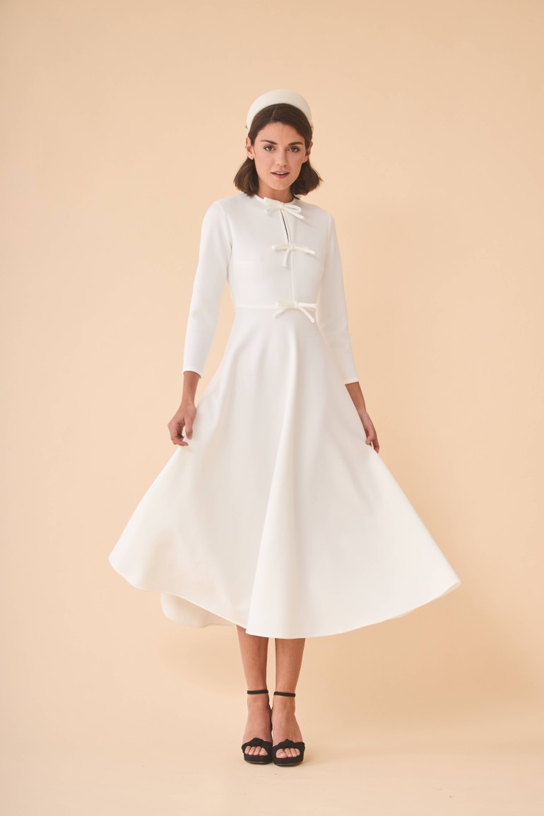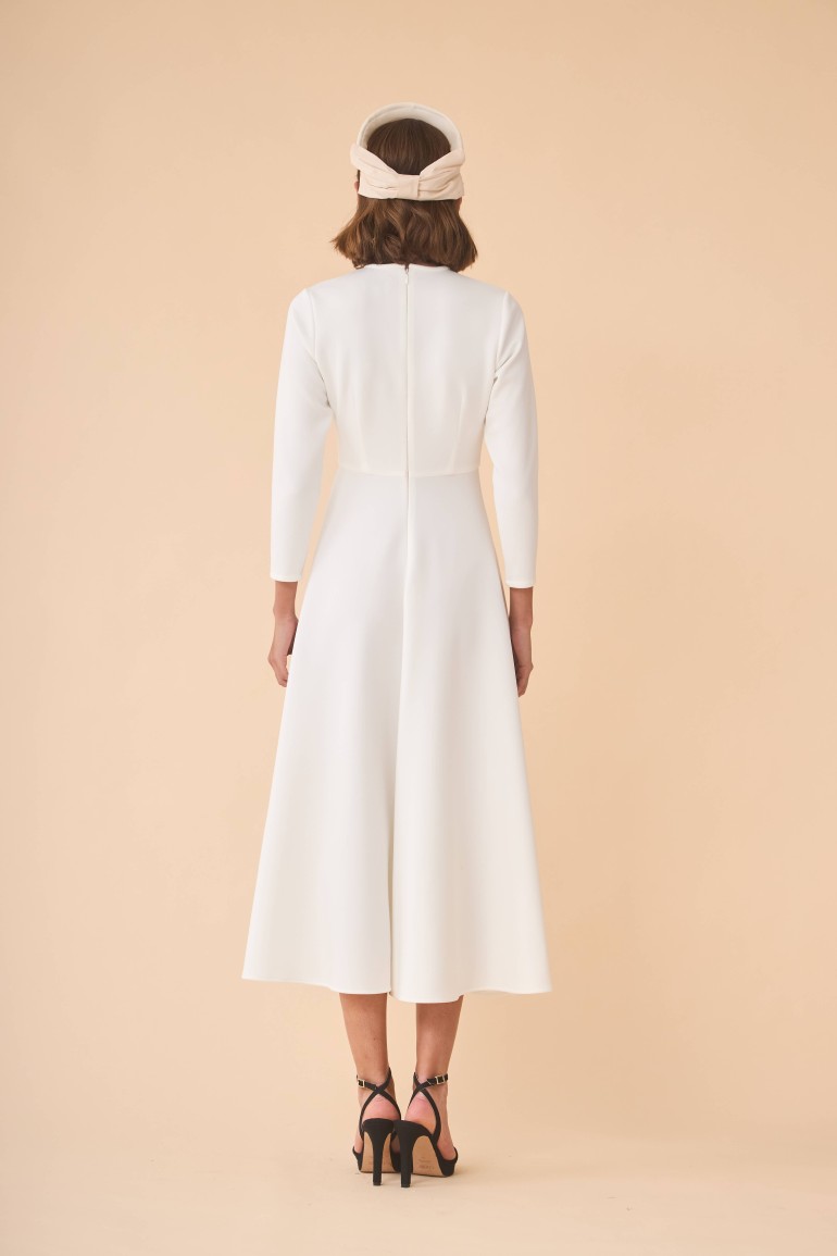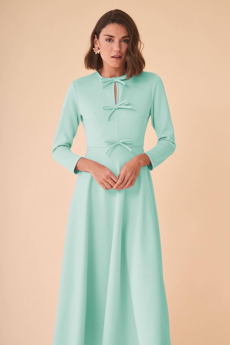 Vestido confeccionado en neopreno color azul celeste. Cuello redondo y manga larga. Detalles de lazos en el pecho y abertura central. Corte en la cintura y falda evasé. Cierre trasero con cremallera invisible.