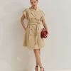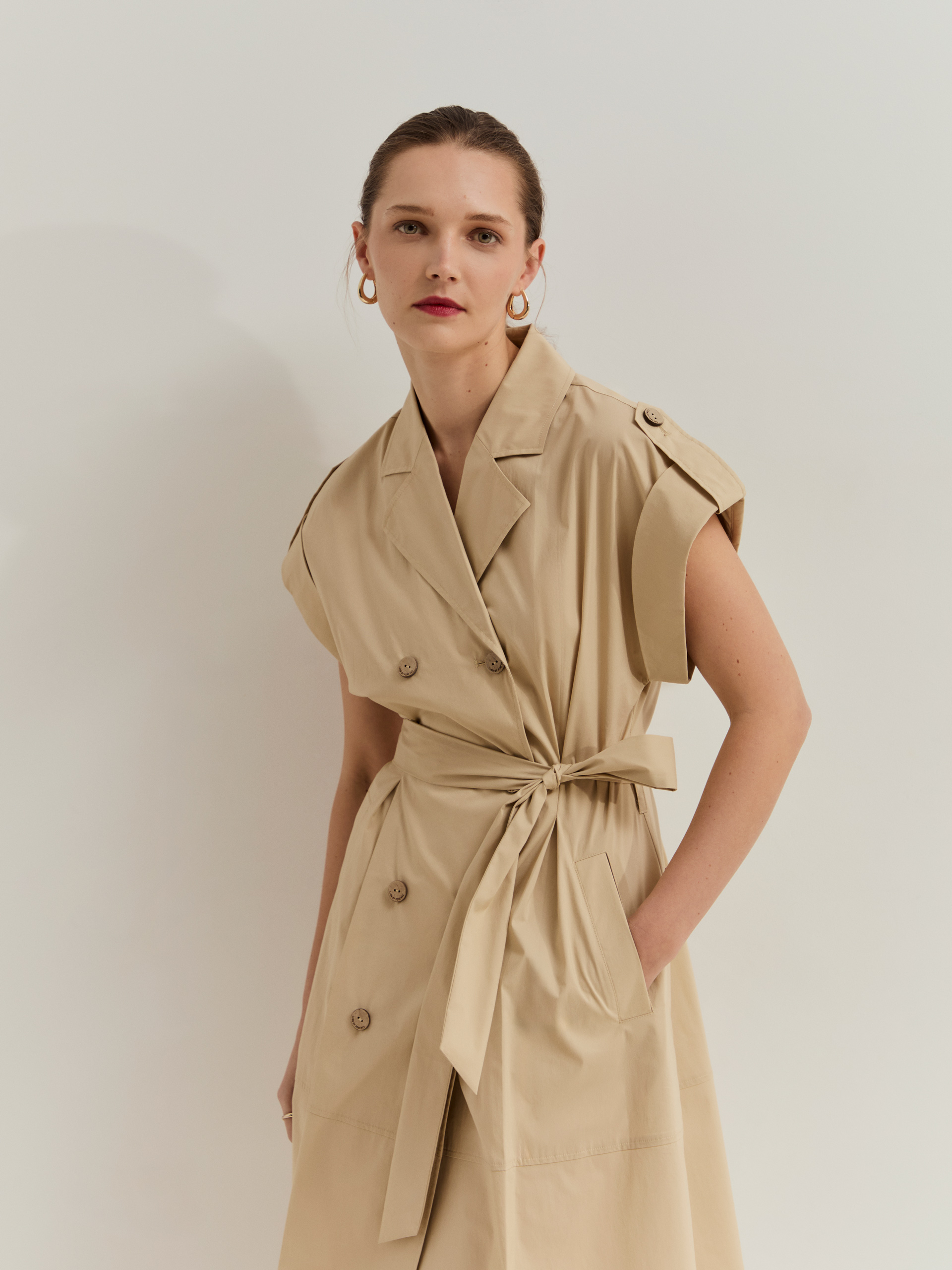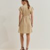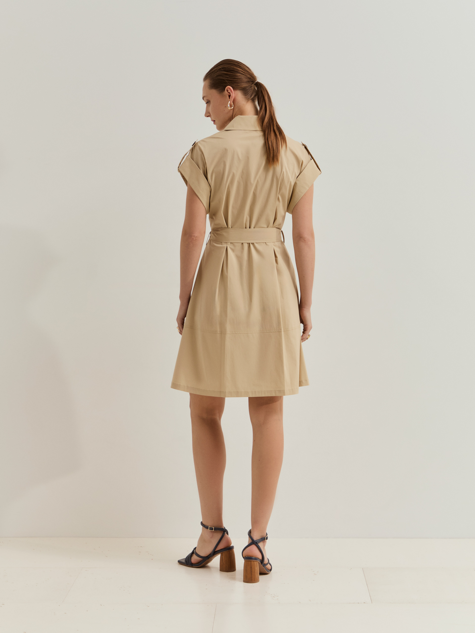 Vestido de gabardina hasta la rodilla con mangas cortas, con delicadas tablas en la parte delantera y trasera que aportan movimiento y sofisticación. Presenta botones personalizados en la parte delantera, bolsillos de ojal frontales y cinturón para un ajuste perfecto y un toque estructurado. Una pieza elegante y versátil.