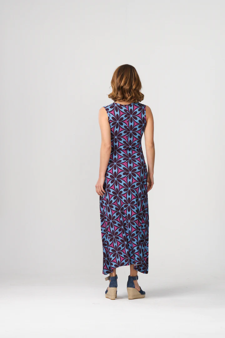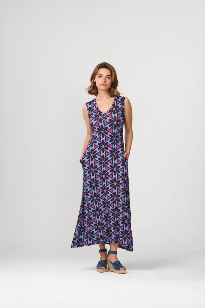 Vestido de punto de viscosa con vuelo, sin manga con cuello pico y bolsillos.