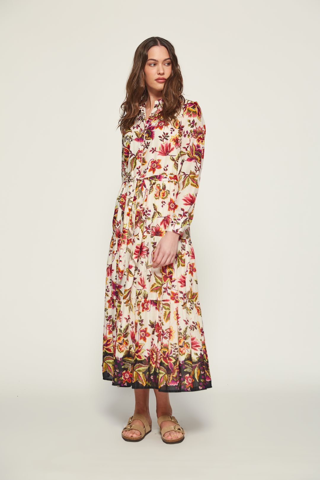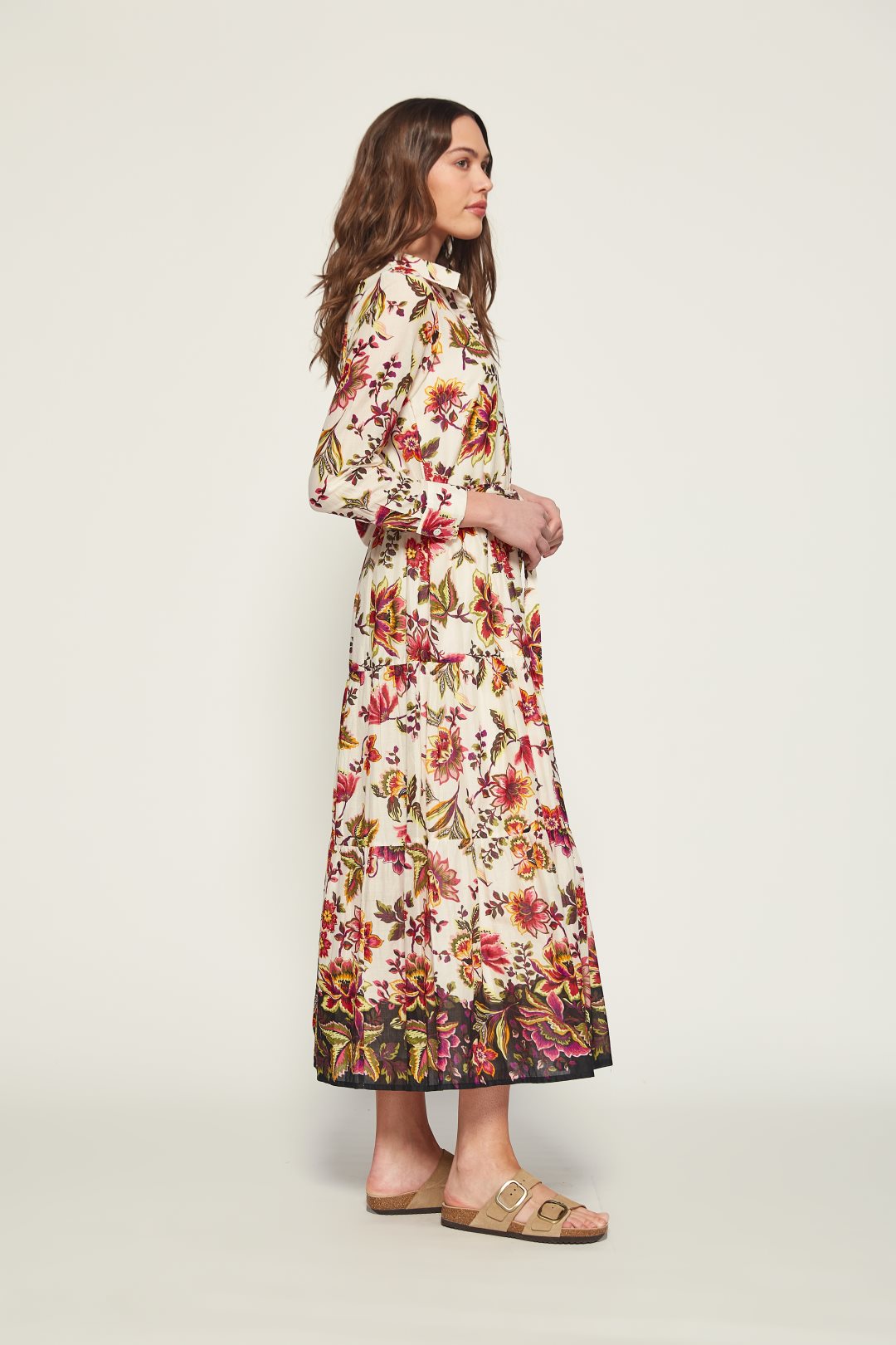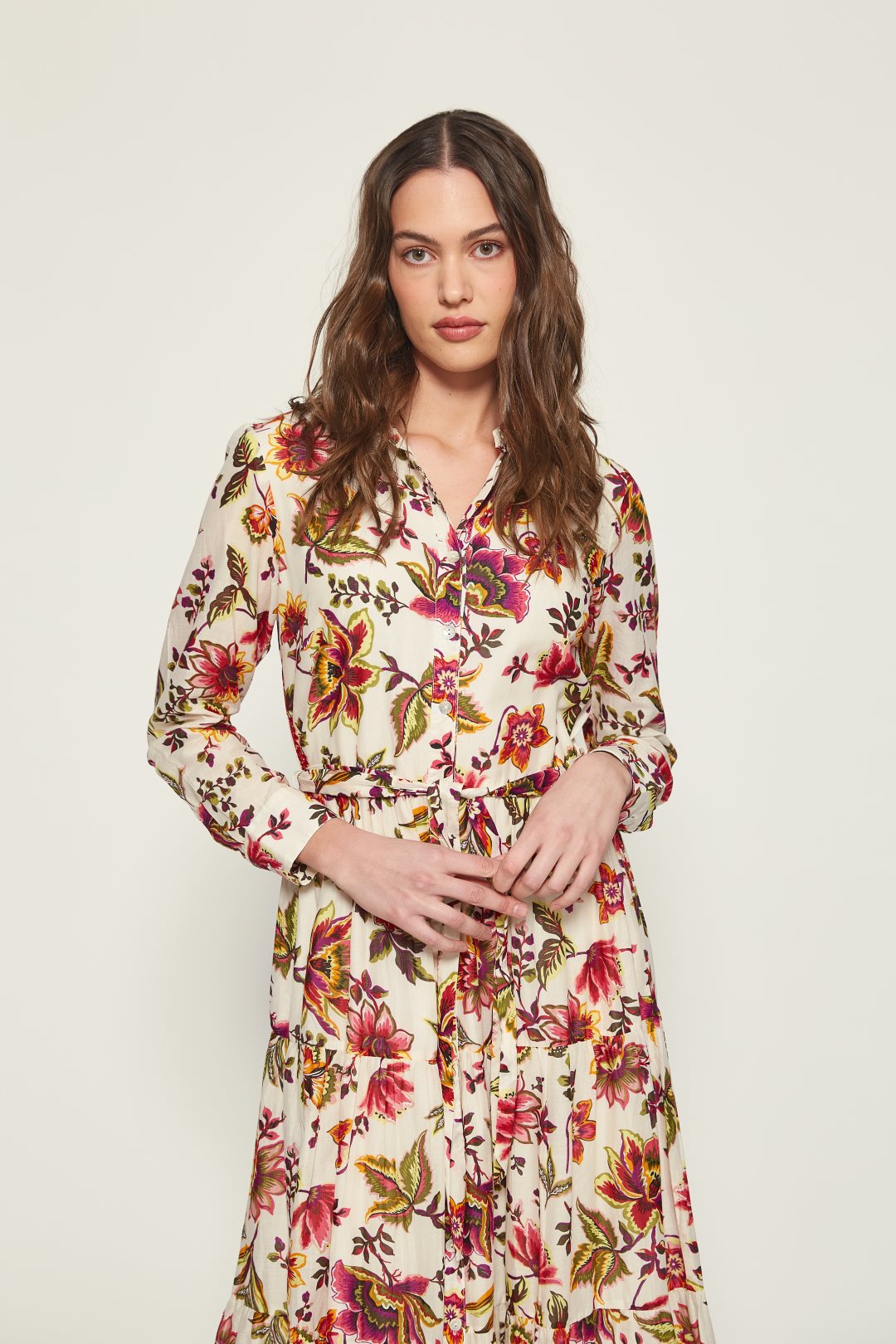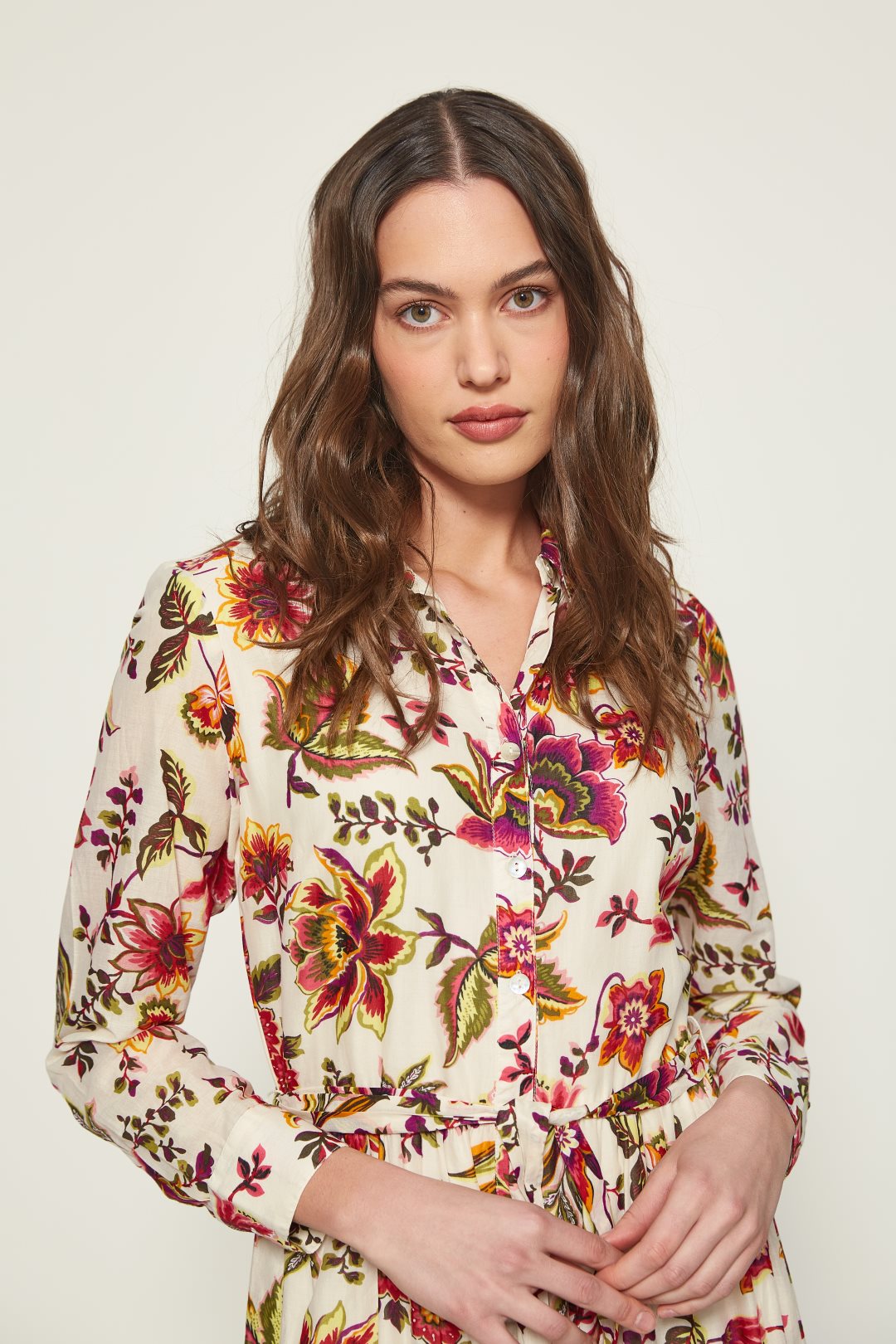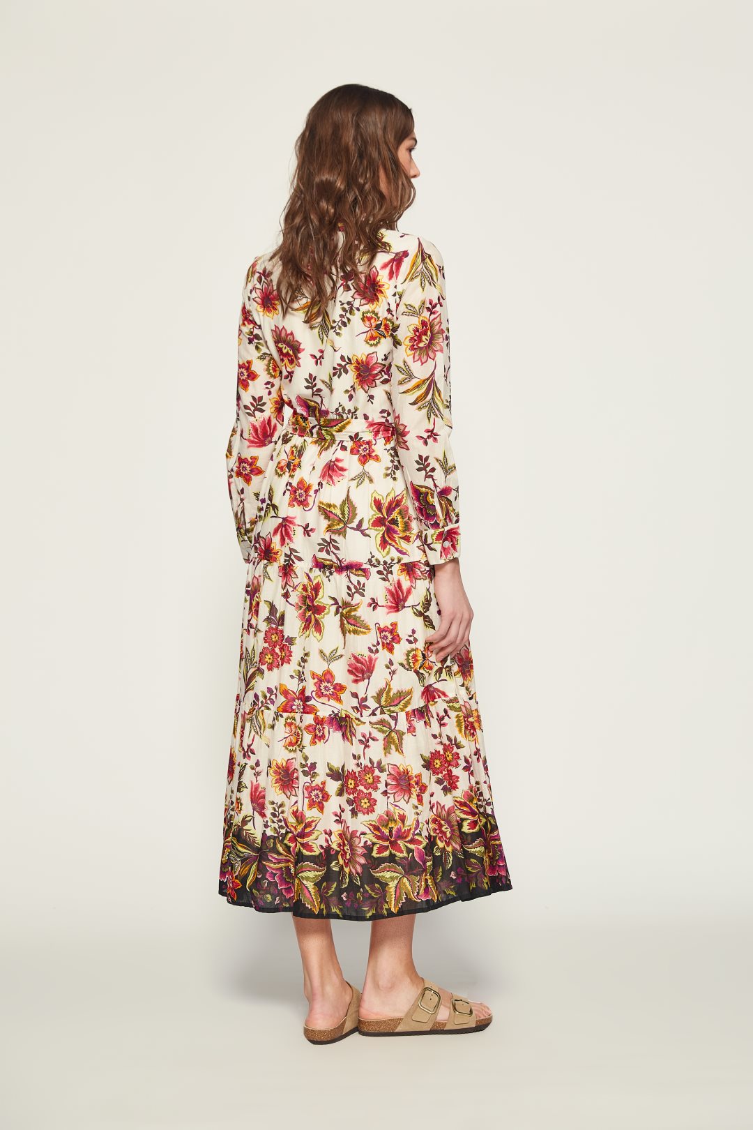 Vestido camisero largo de flores de manga larga. Confeccionado en 100% algodón, incluye cinturón ajustable, botones frontales. Color rojo