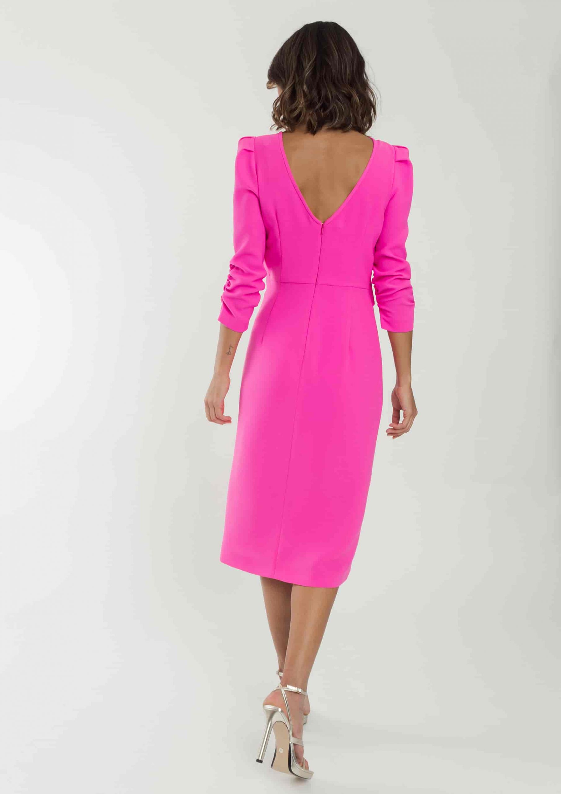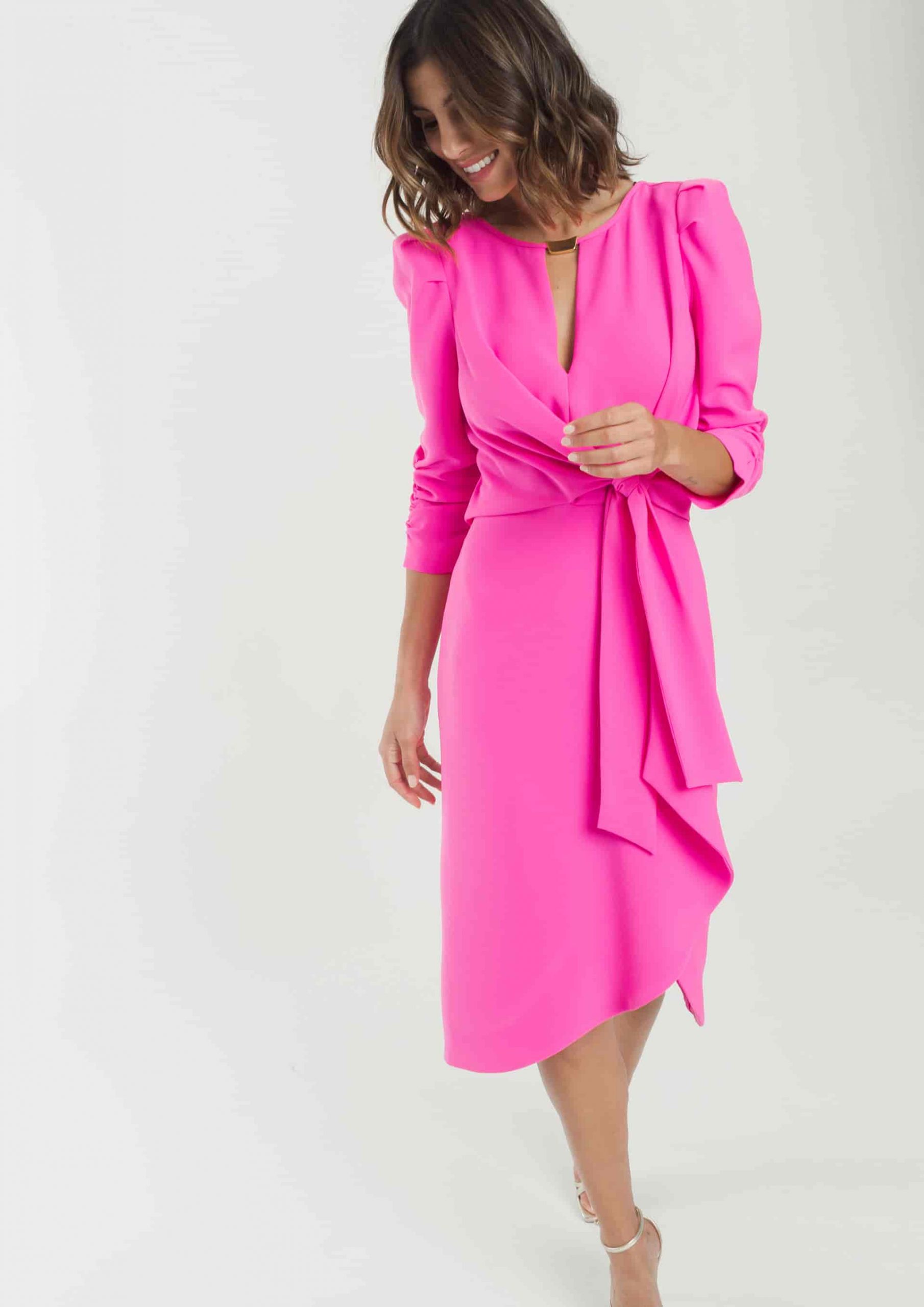 Vestido de cóctel con mangas abullonadas y lazada en delantero. Este diseño de corte entallado presenta escote redondo con abertura frontal y detalle de pliegues en hombros. Bajo asimétrico con abertura frontal. Espalda con escote pico y cremallera central invisible. Forro interior.