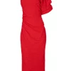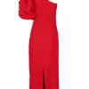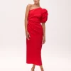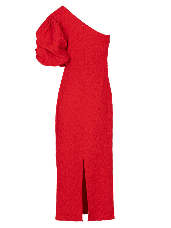 ISABELA RED – Vestido asimétrico manga abullonada damasco floral rojo