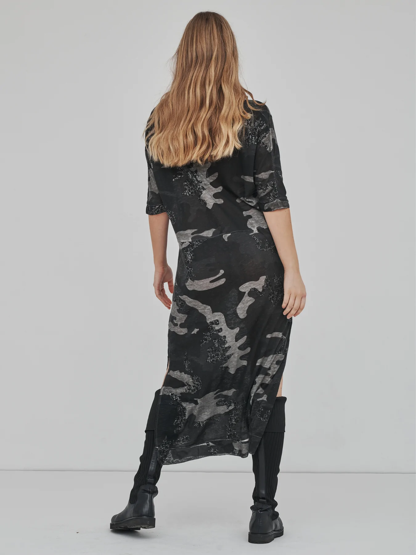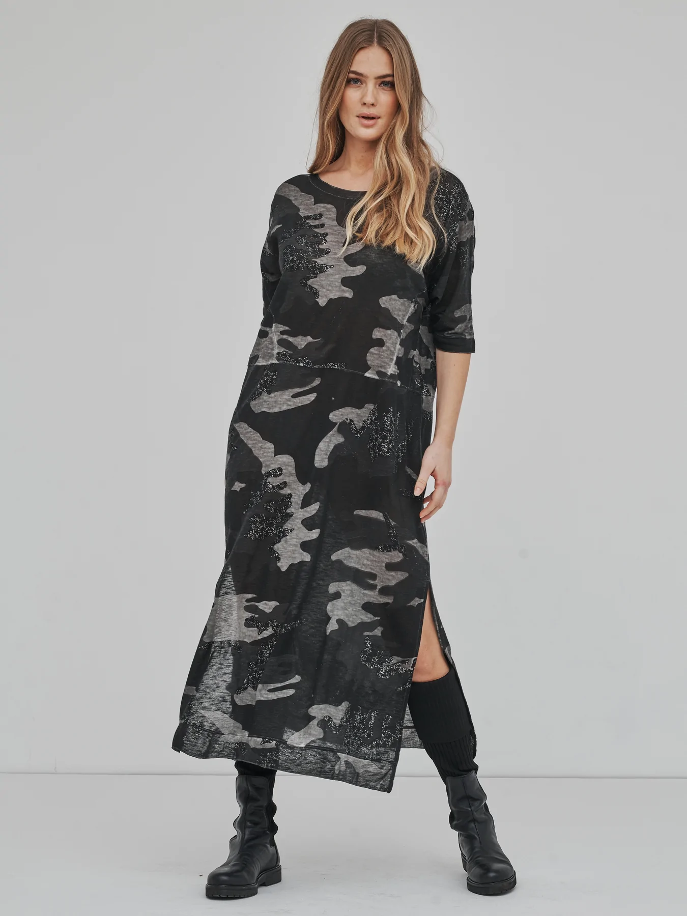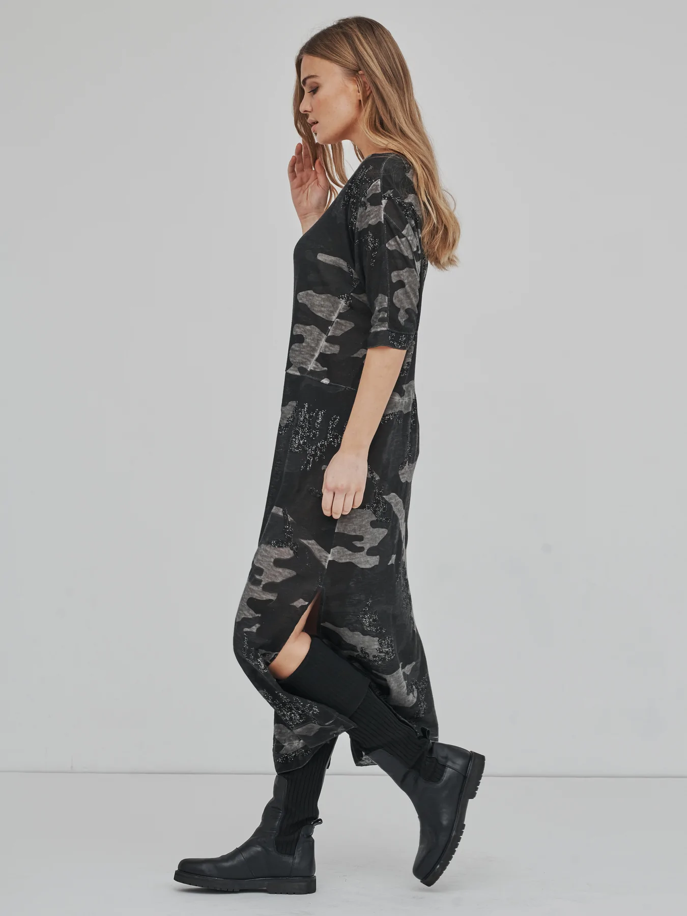 Vestido estampado con un elegante estampado militar confeccionado en un tejido de puro algodón, diseñado con una expresión bohemia con corte largo y mangas medias. Las dos aberturas en la parte inferior crean movimiento en el vestido largo y, junto con el ajuste holgado, brindan una gran comodidad. Combínalo con un par de botas para lograr un estilo moderno y femenino.