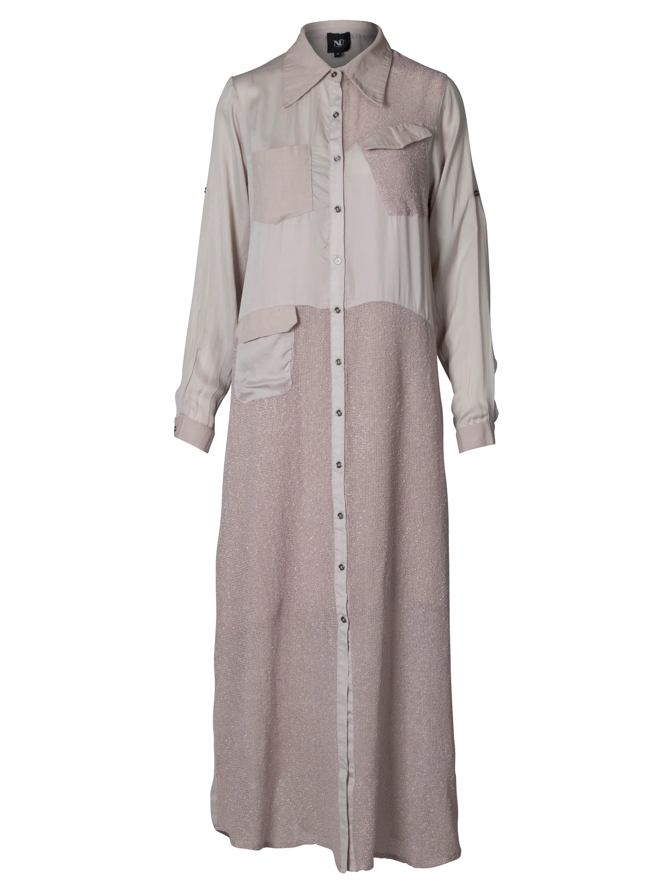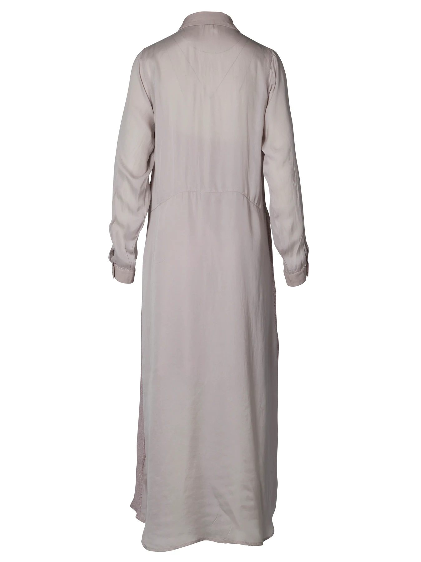 Precioso vestido camisero confeccionado en un suave y cómodo tejido de mezcla de materiales. El vestido tiene un corte largo con detalles geniales, cierre con botones y mangas largas que se pueden remangar. El vestido también tiene una combinación para evitar la transparencia.