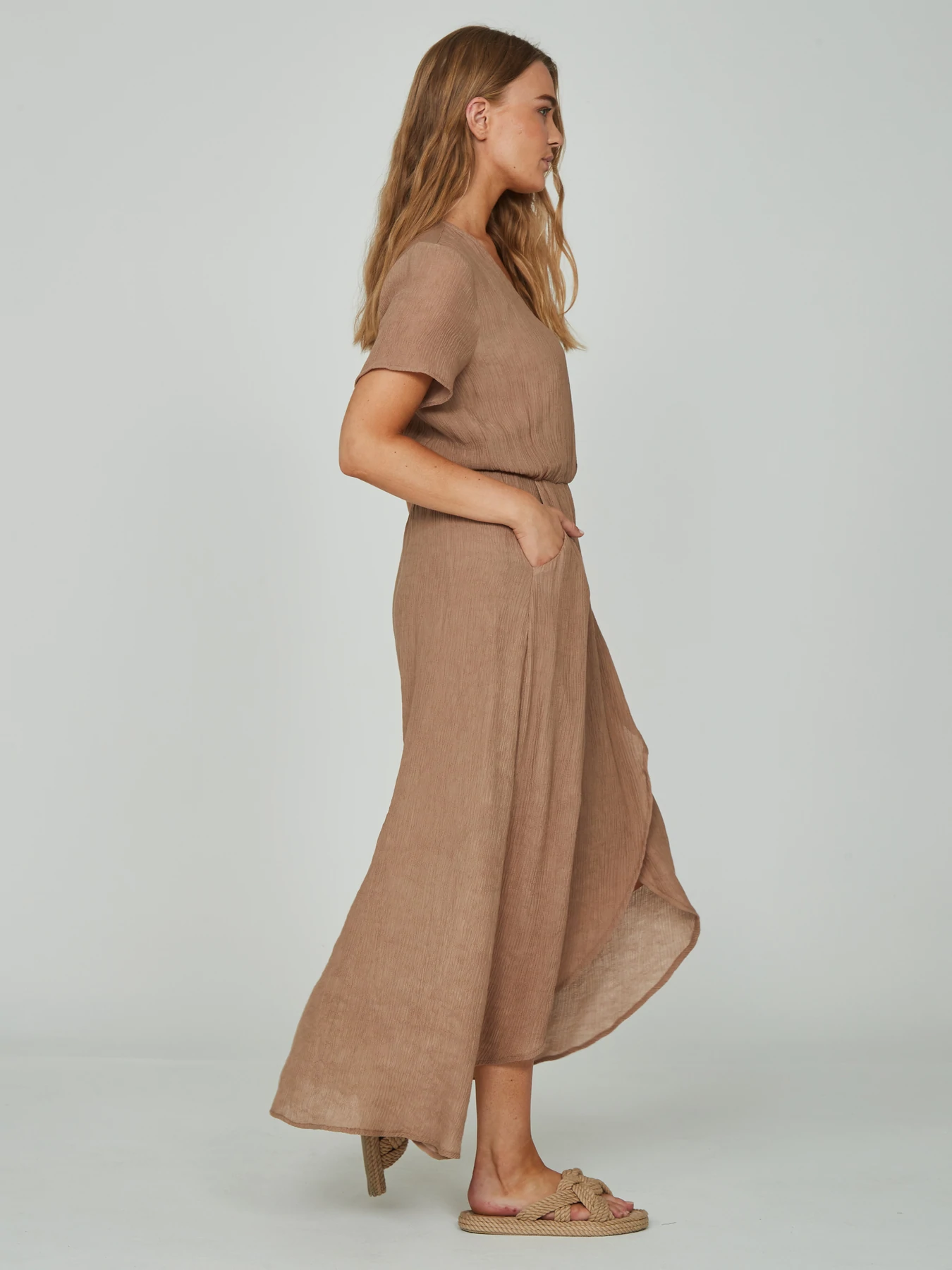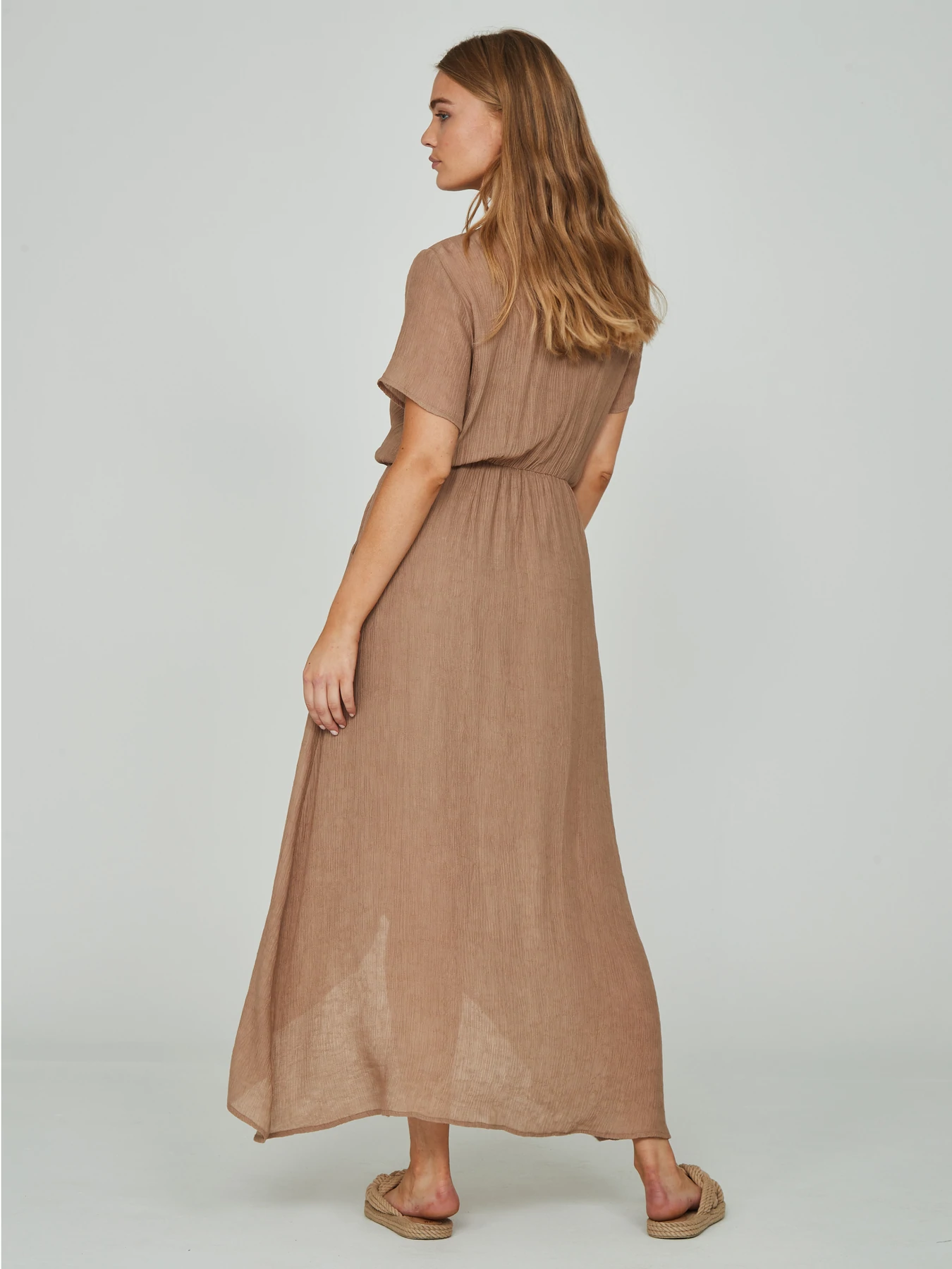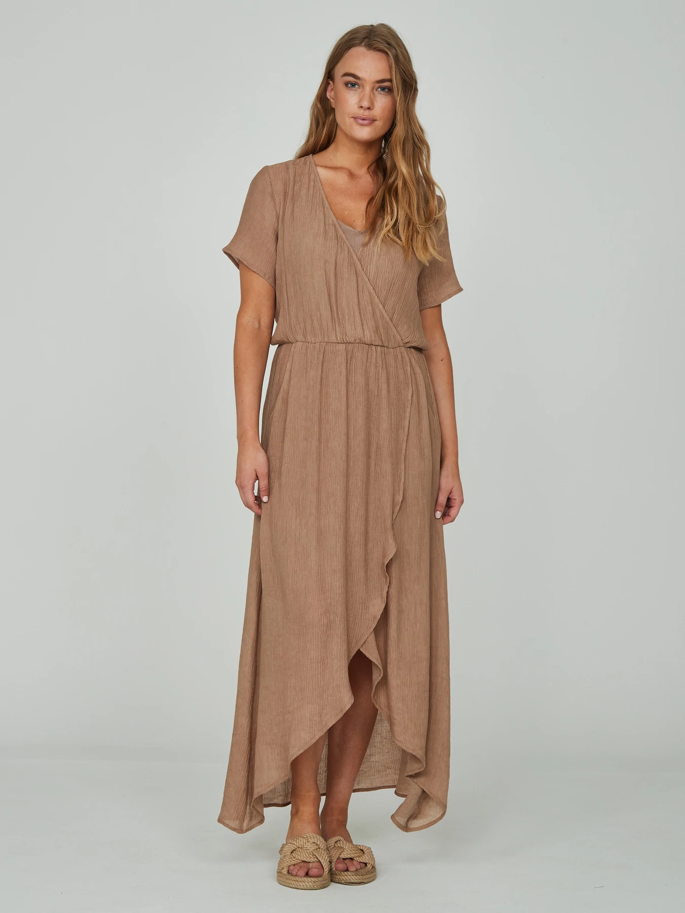 Precioso vestido confeccionado en un tejido de viscosa ligero y transpirable. El vestido largo tiene un bonito escote en V y una cintura elástica que crea un elegante efecto envolvente. El vestido también tiene una combinación para evitar la transparencia.