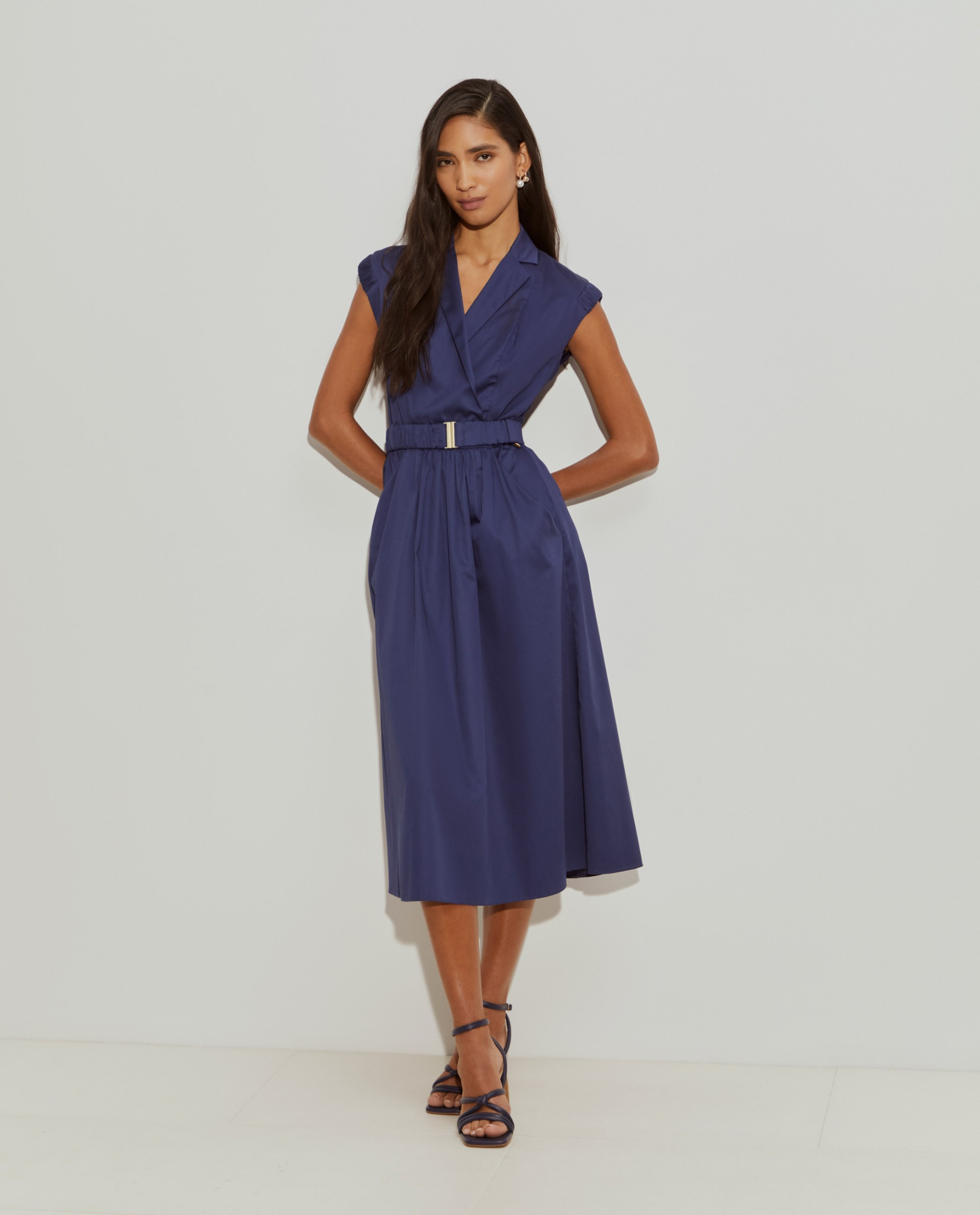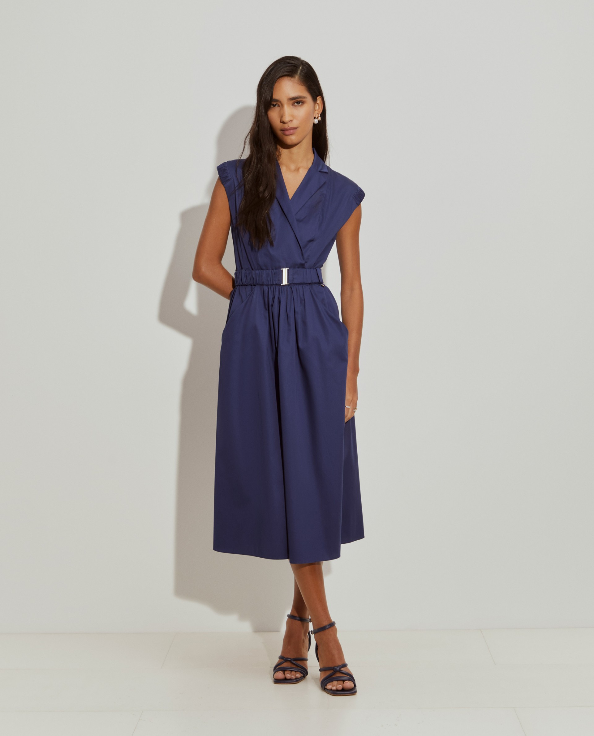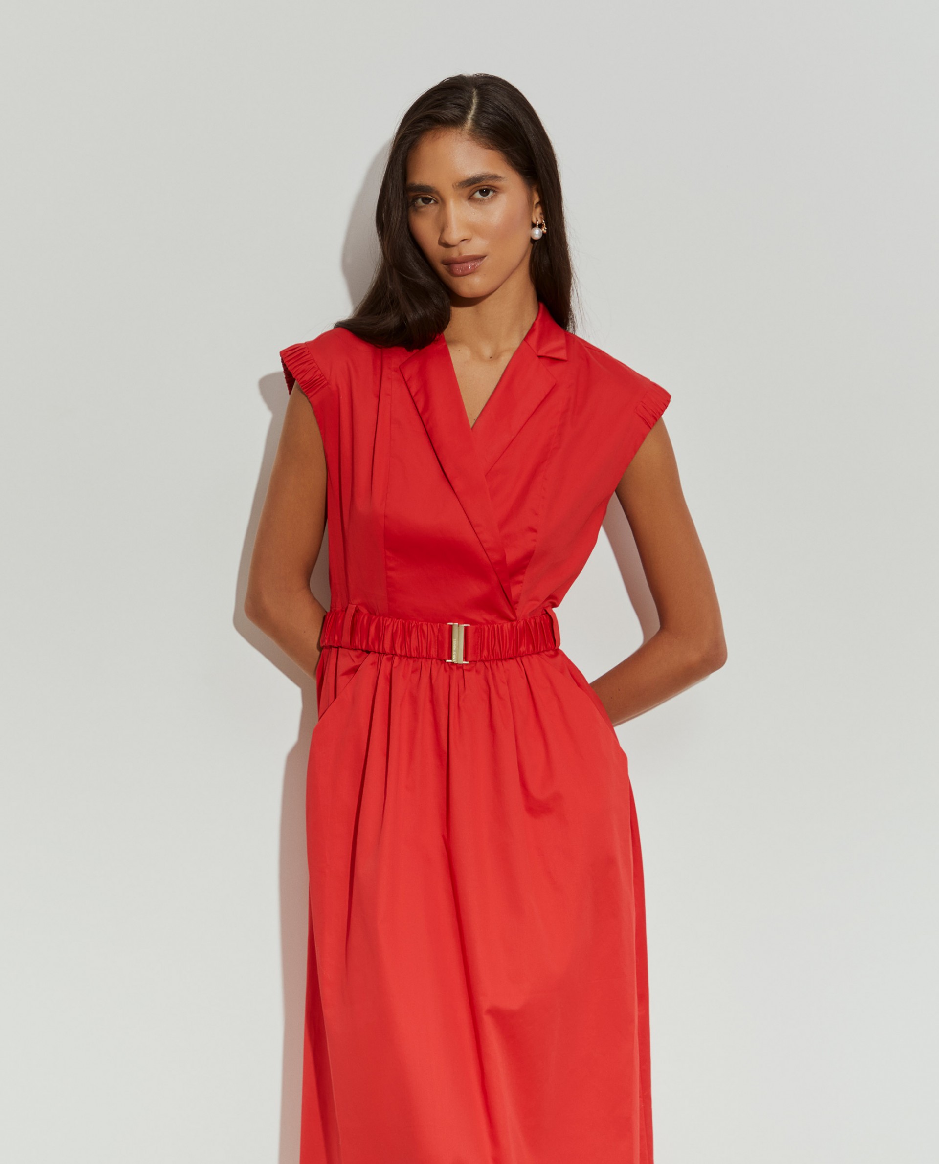 Vestido largo cruzado, perfecto para las estaciones más cálidas. Sin mangas, con escote en pico y aplicaciones elásticas en la parte superior de los hombros. La falda fruncida en la cintura define la silueta, al igual que el cinturón elástico. Con bolsillos delanteros. Está fabricado íntegramente en algodón, proporcionando una sensación suave y confortable en la piel.