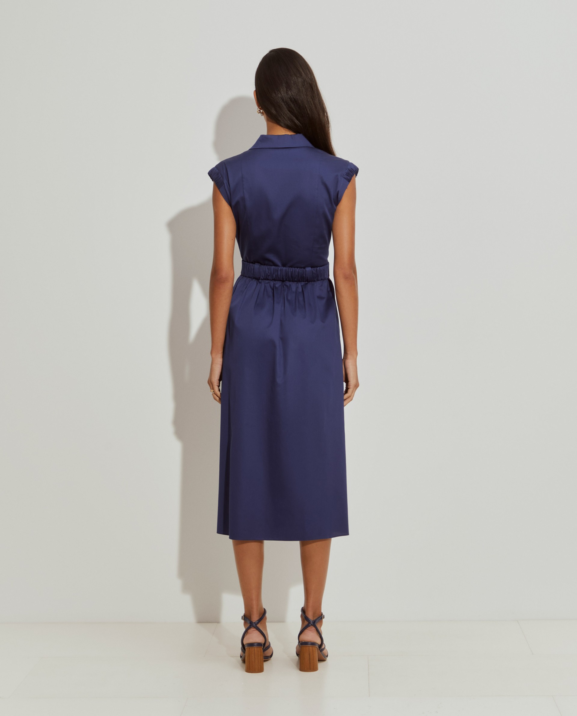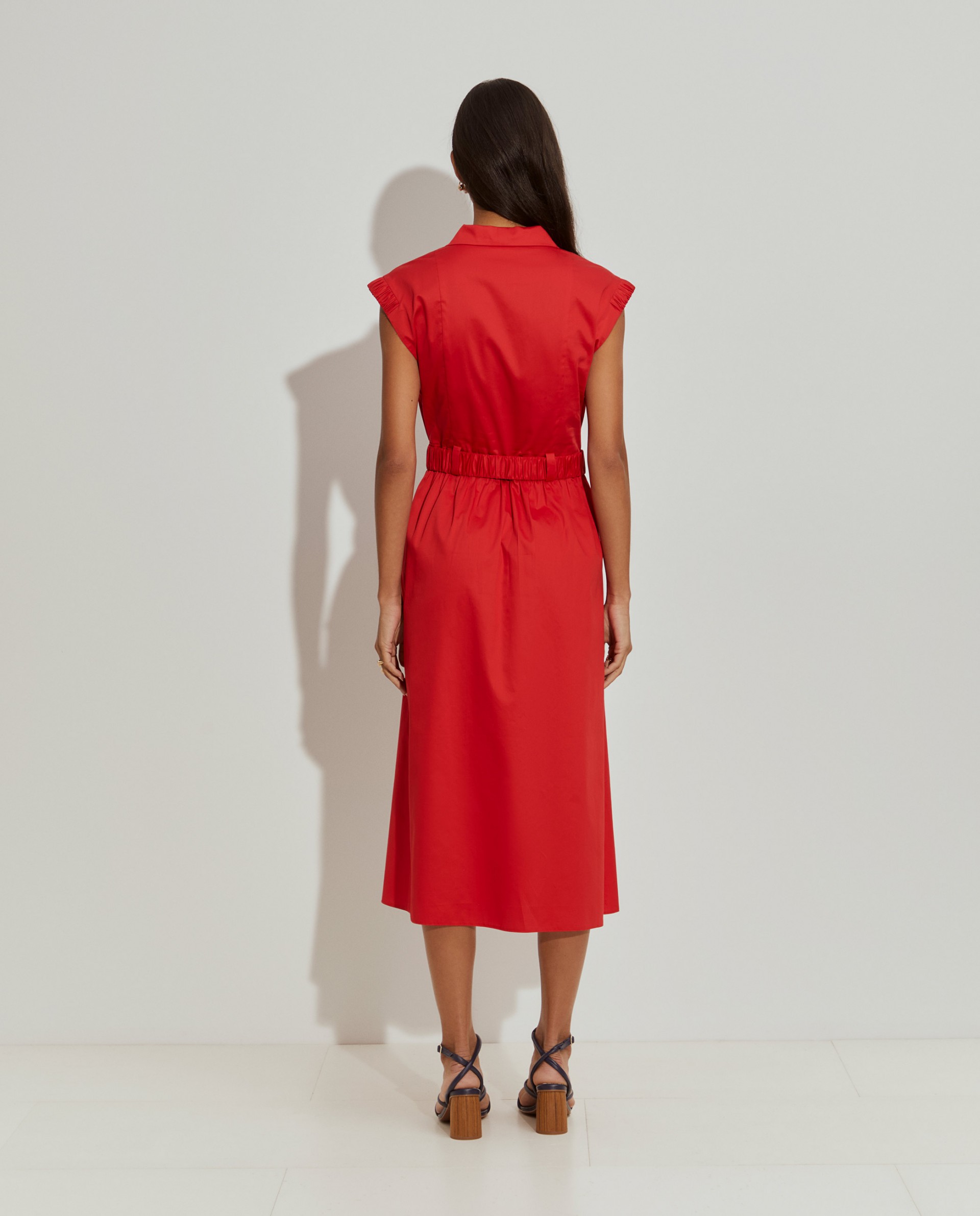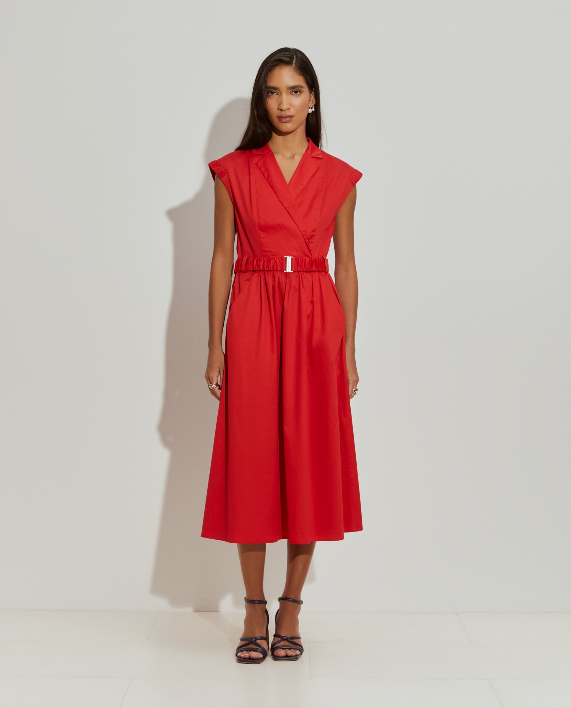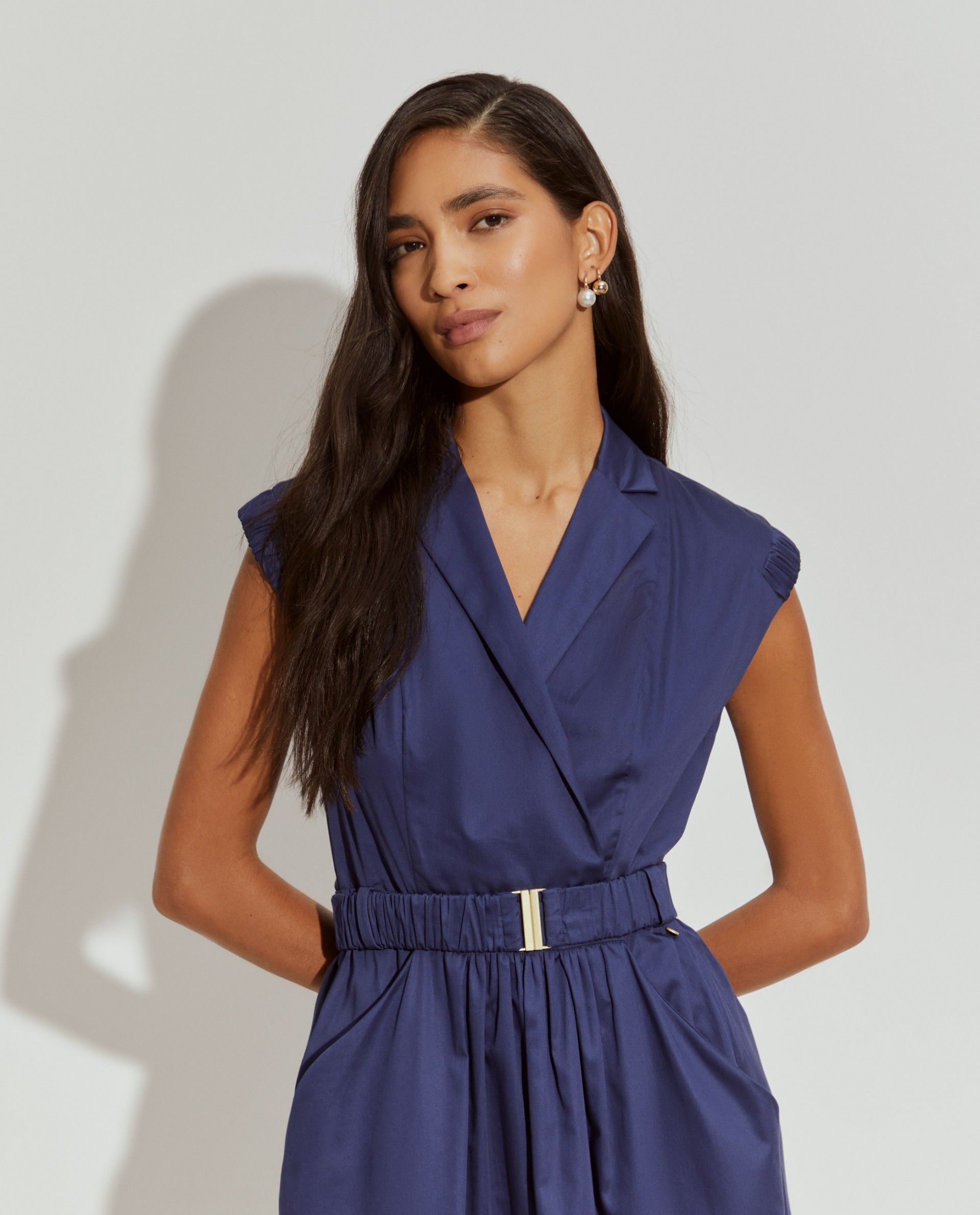 Vestido largo cruzado, perfecto para las estaciones más cálidas. Sin mangas, con escote en pico y aplicaciones elásticas en la parte superior de los hombros. La falda fruncida en la cintura define la silueta, al igual que el cinturón elástico. Con bolsillos delanteros. Está fabricado íntegramente en algodón, proporcionando una sensación suave y confortable en la piel.