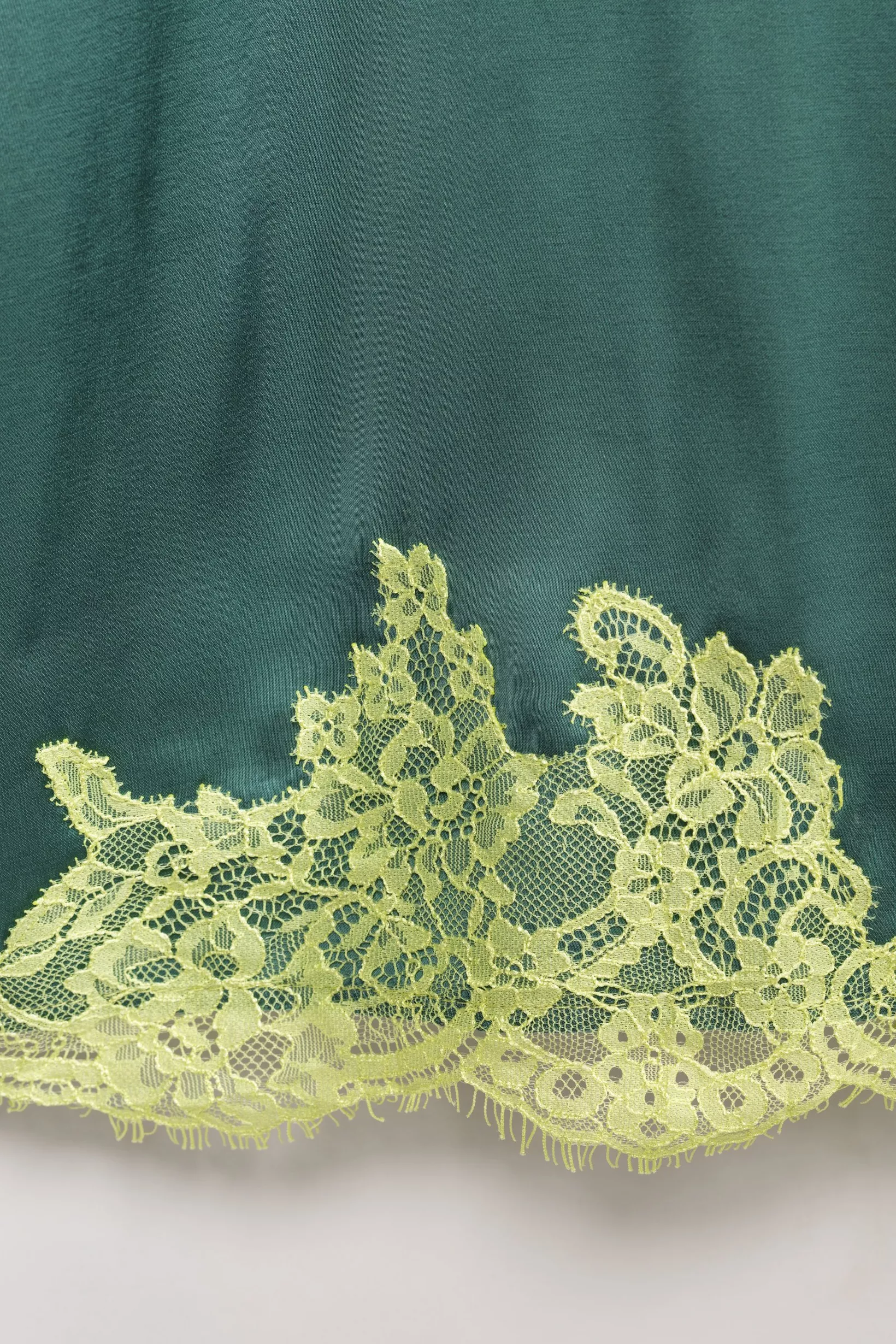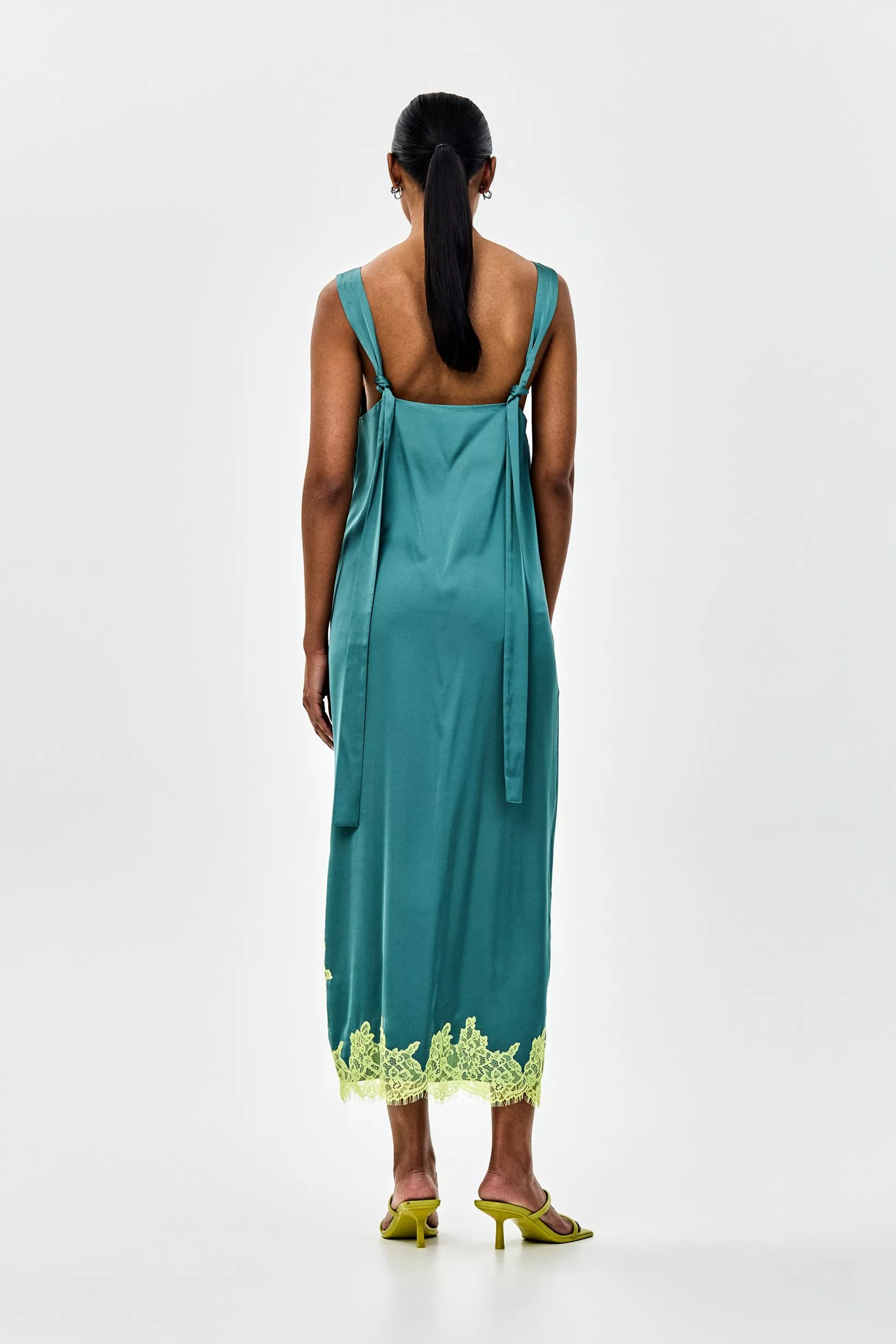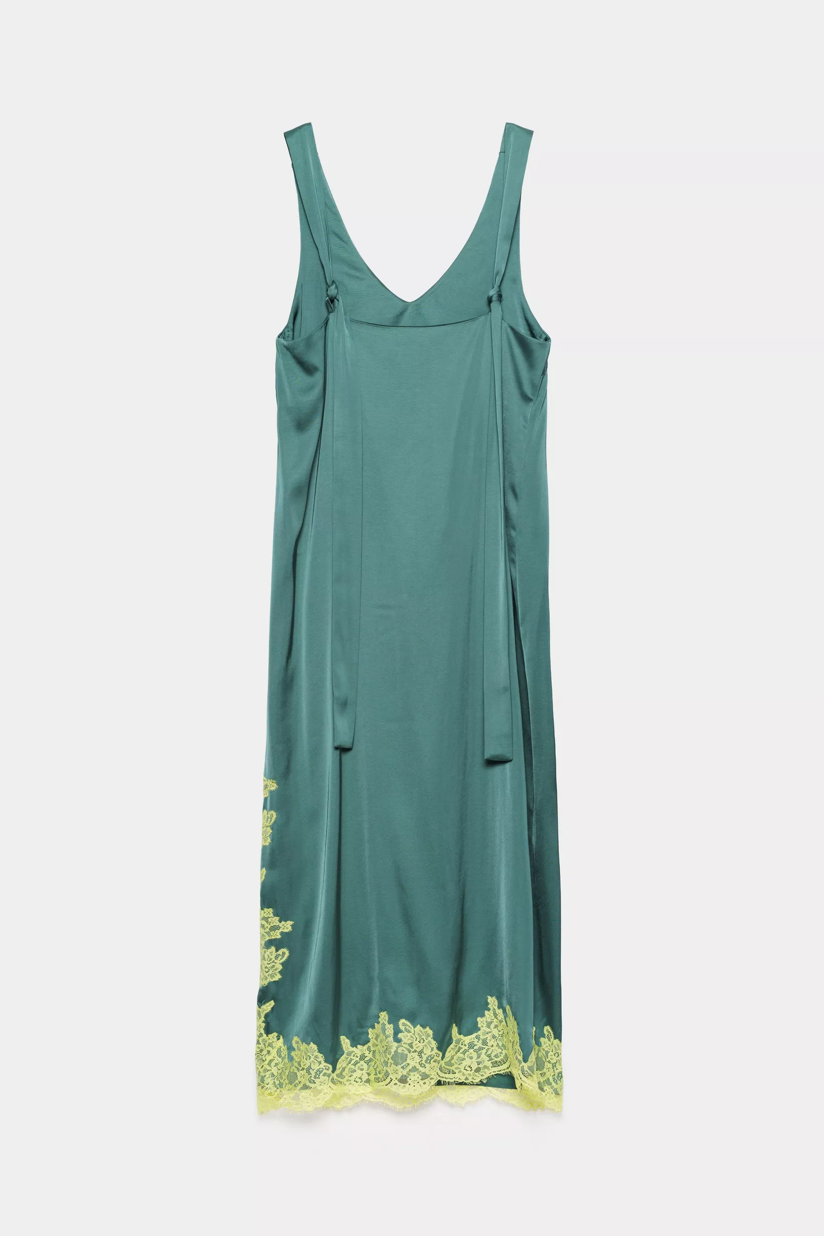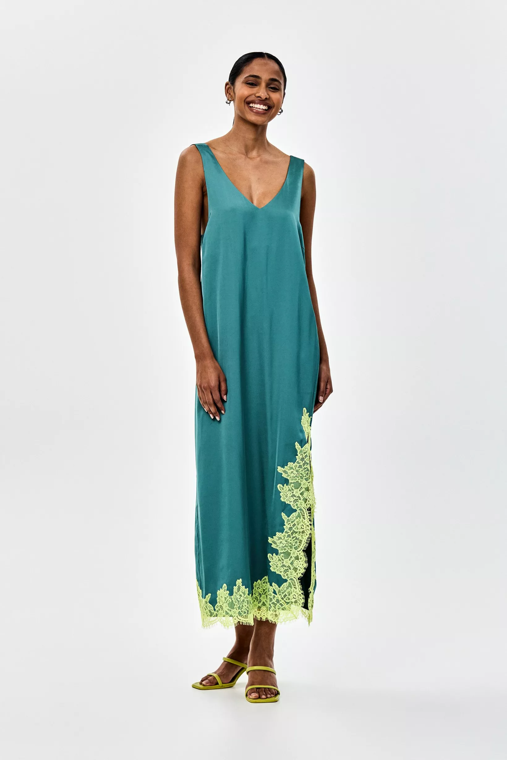 ¡Sé la mejor invitada! Desde una boda hasta un aperitivo con amigas: con este vestido largo verde para mujer, serás el centro de atención una y otra vez. Un brillante tejido satinado se combina con detalles de encaje en contraste amarillo verdoso y una división