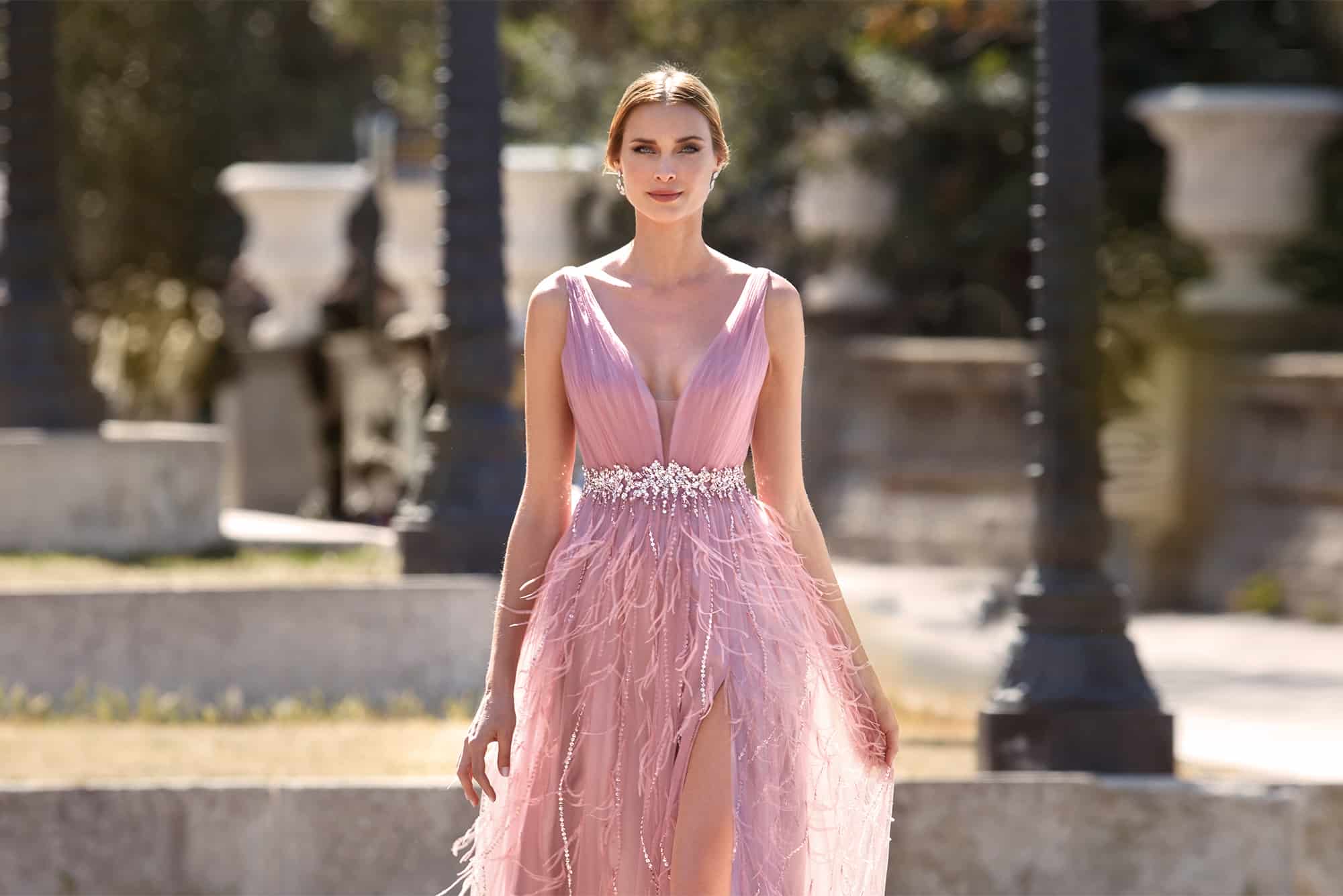 Vestido largo vaporoso plumas