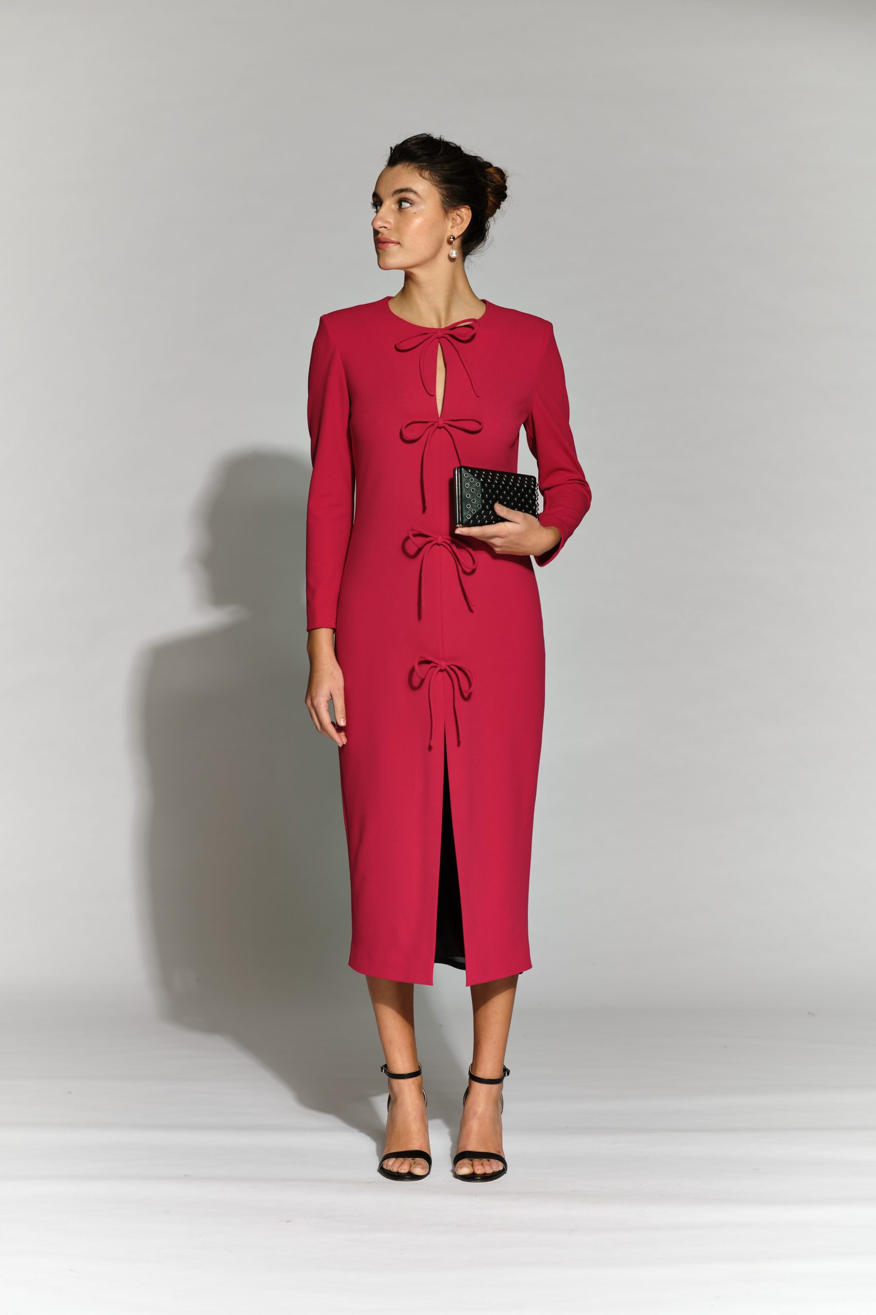 Vestido midi recto manga larga 3 lazos abertura