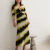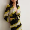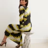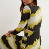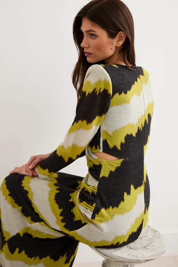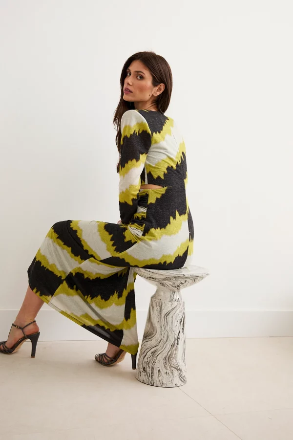 El estampado gráfico en tonos lima, negro y gris claro evoca un paisaje abstracto con energía vibrante, aportando dinamismo y carácter a la prenda. Con aberturas laterales sutiles a la altura de la cintura, el vestido Mastie juega con el equilibrio entre sofisticación y atrevimiento.