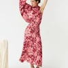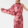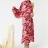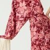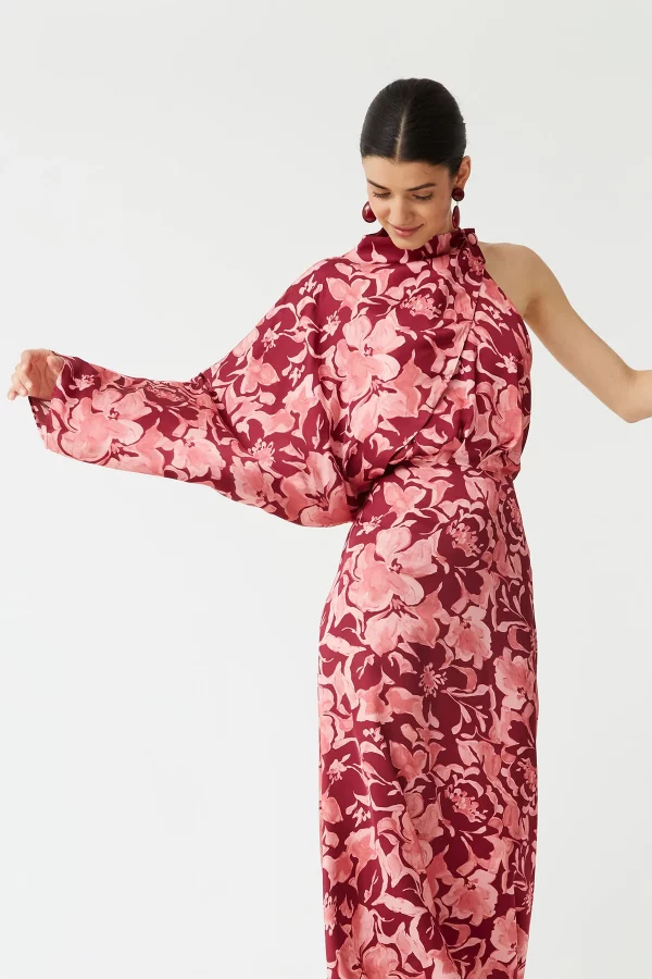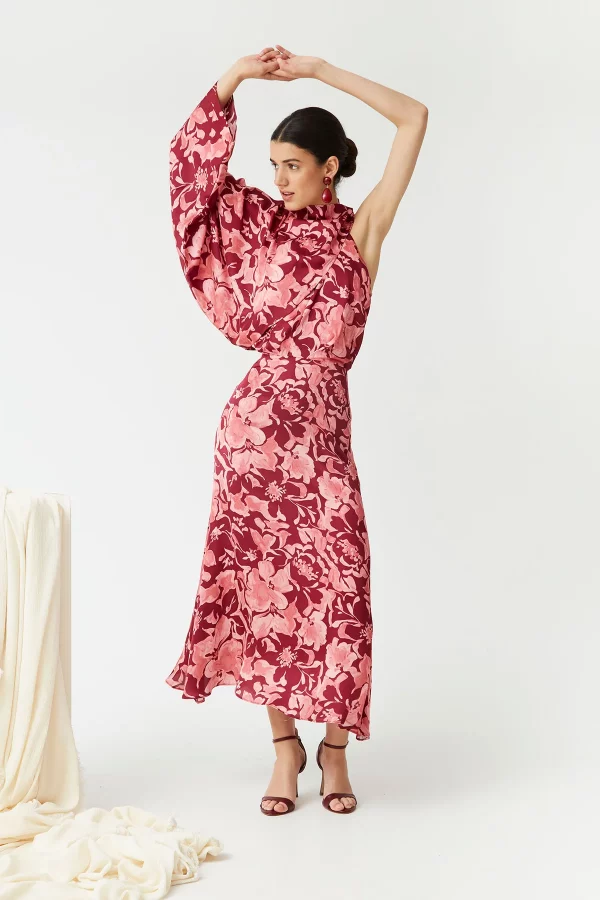 Este vestido midi de estampado floral granate y rosa es una declaración de estilo para invitadas que buscan originalidad y sofisticación. Su diseño asimétrico con una espectacular manga amplia, completamente desmontable, permite transformarlo en un look más minimal con un solo gesto.