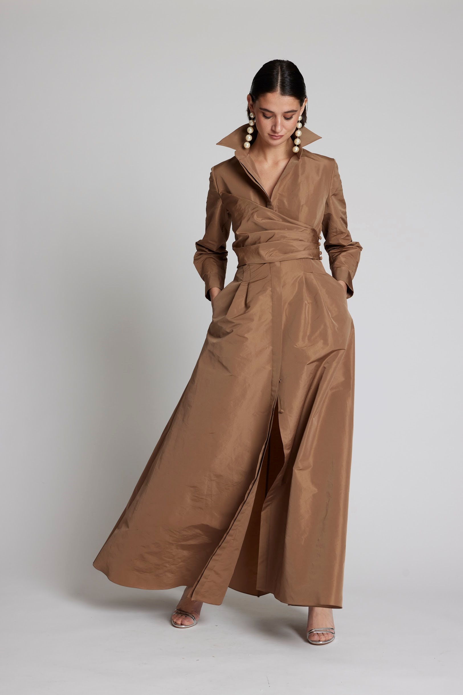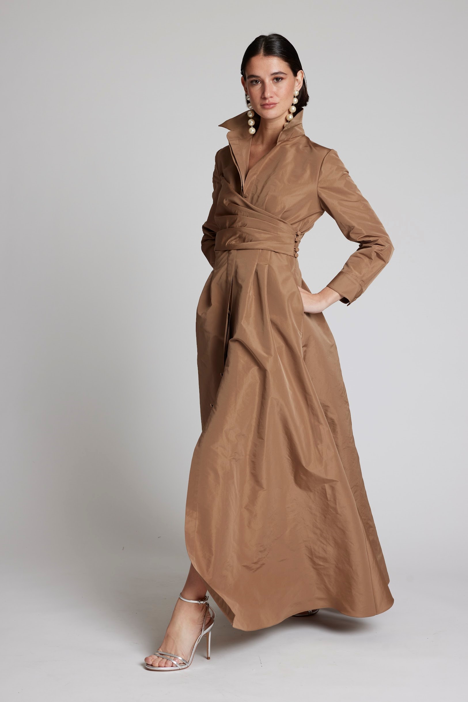 Vestido largo para ceremonia de tafetán, con drapeado en cintura