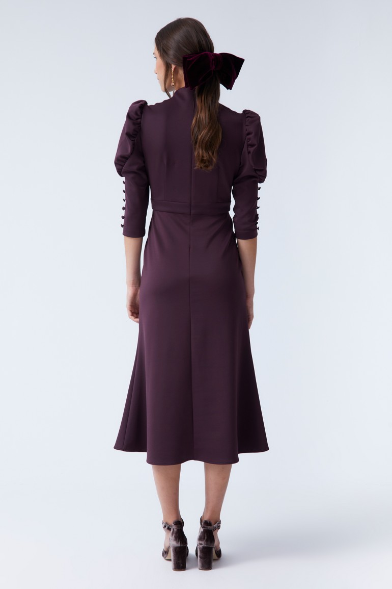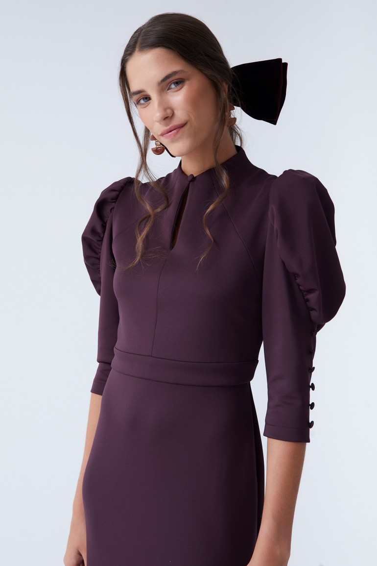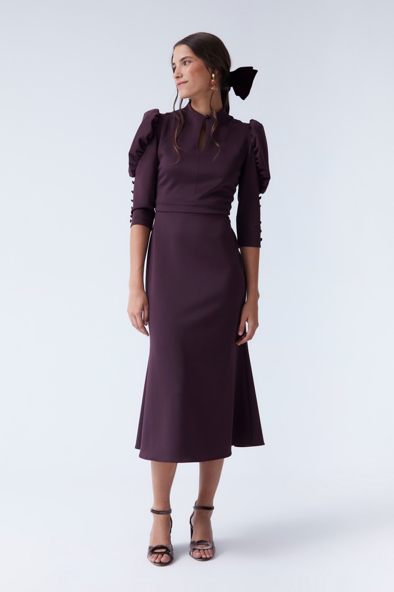 Este vestido midi en tono burdeos es la opción perfecta para quienes buscan un estilo elegante y sofisticado. Con mangas abullonadas y detalles de botones en los puños, este diseño aporta un toque clásico y a la vez moderno. Su corte ceñido a la cintura y la caída fluida lo convierten en una prenda ideal para eventos formales o celebraciones especiales.