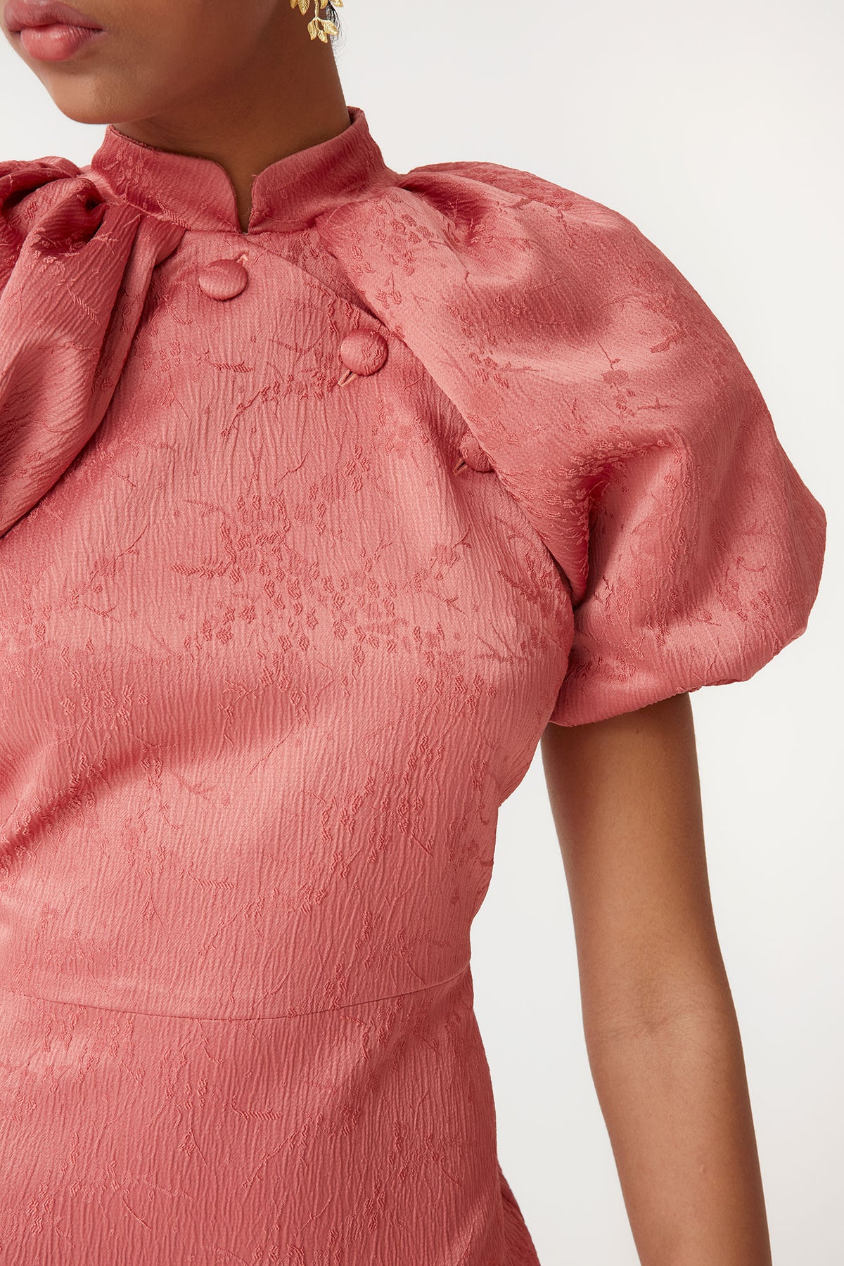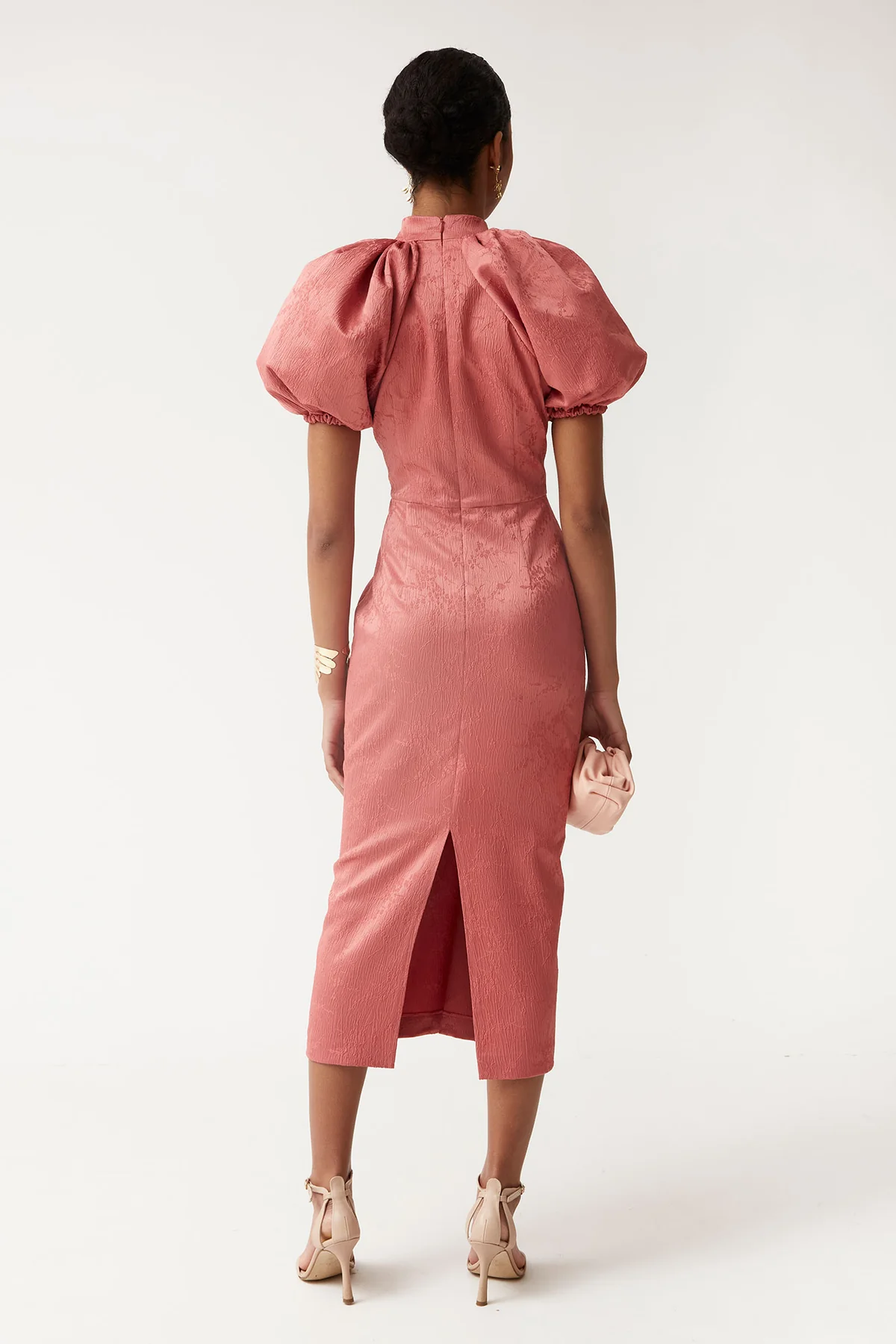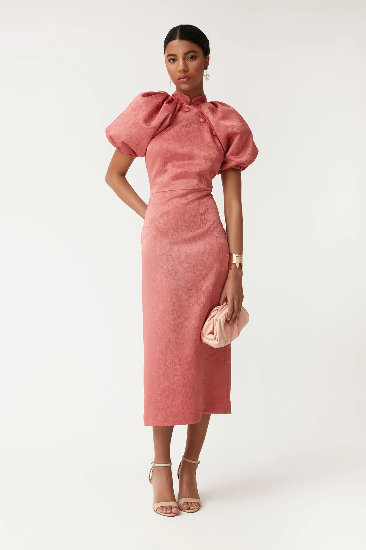 Eleva tu estilo con este vestido midi en tono rosa empolvado, confeccionado en un tejido jacquard con sutil brillo y textura floral. Su silueta entallada realza la figura, mientras que las espectaculares mangas abullonadas y los botones forrados en el pecho añaden un toque de sofisticación y tendencia. El cuello mao aporta un aire refinado que equilibra el volumen superior con la elegancia de la falda lápiz.
