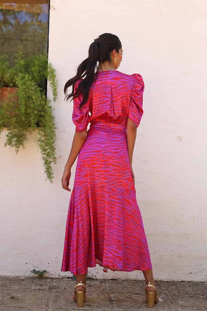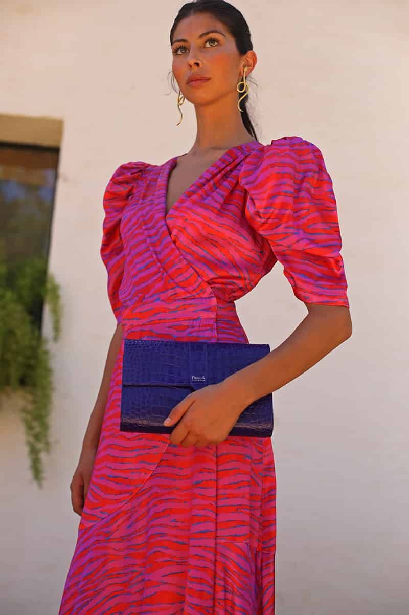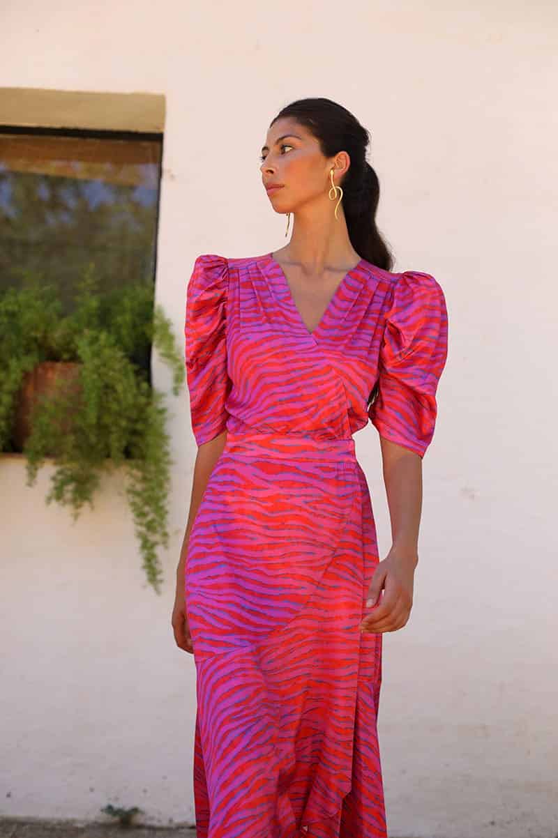 Los vestidos envolventes son todo un must temporada tras temporada, el diseño cruzado hace sienta de 10 a todas las siluetas. Confeccionado en un precioso satén estampado, mangas abullonadas y falda con neja para darle ese vuelo con tanto movimiento.