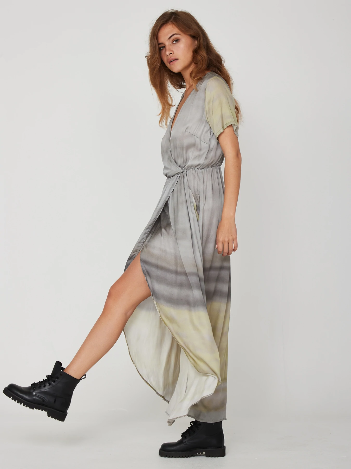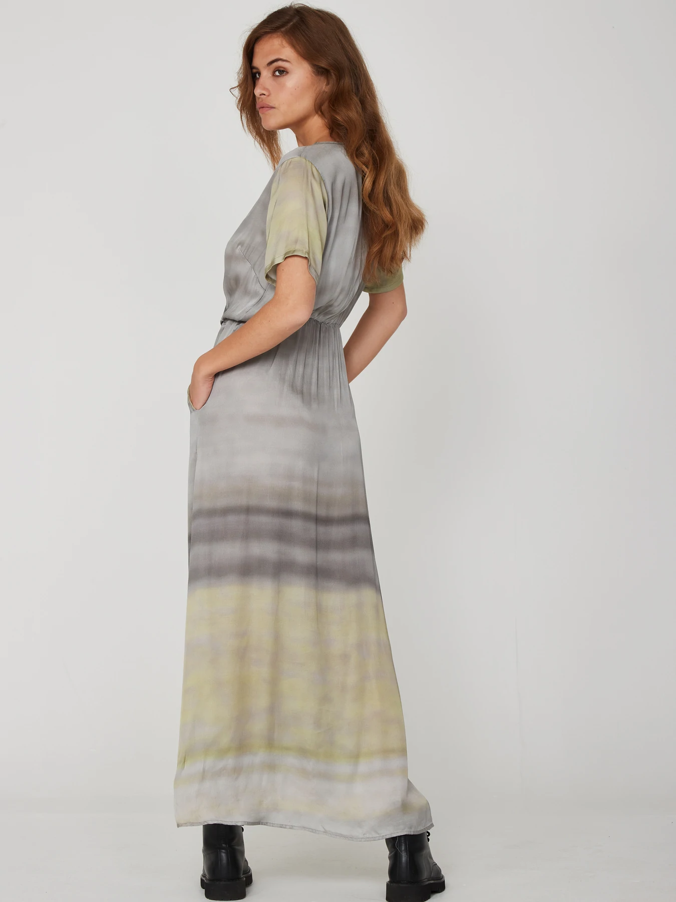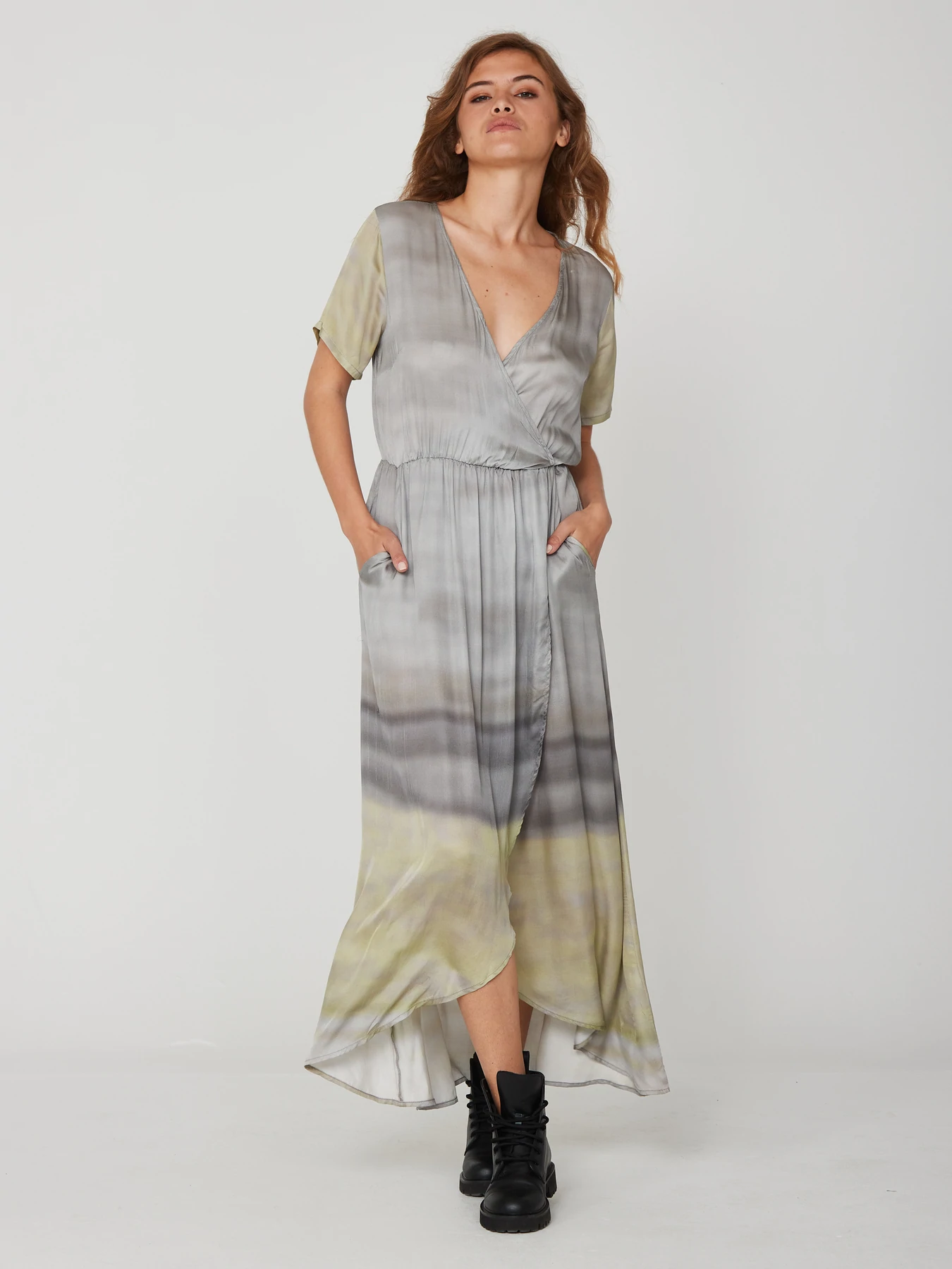 Precioso vestido confeccionado en un tejido de viscosa ligero y suave. El vestido de manga corta tiene un hermoso estampado en tonos verdes y grises, un elegante escote en V y una cintura elástica que crea un look femenino.