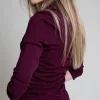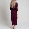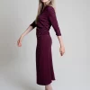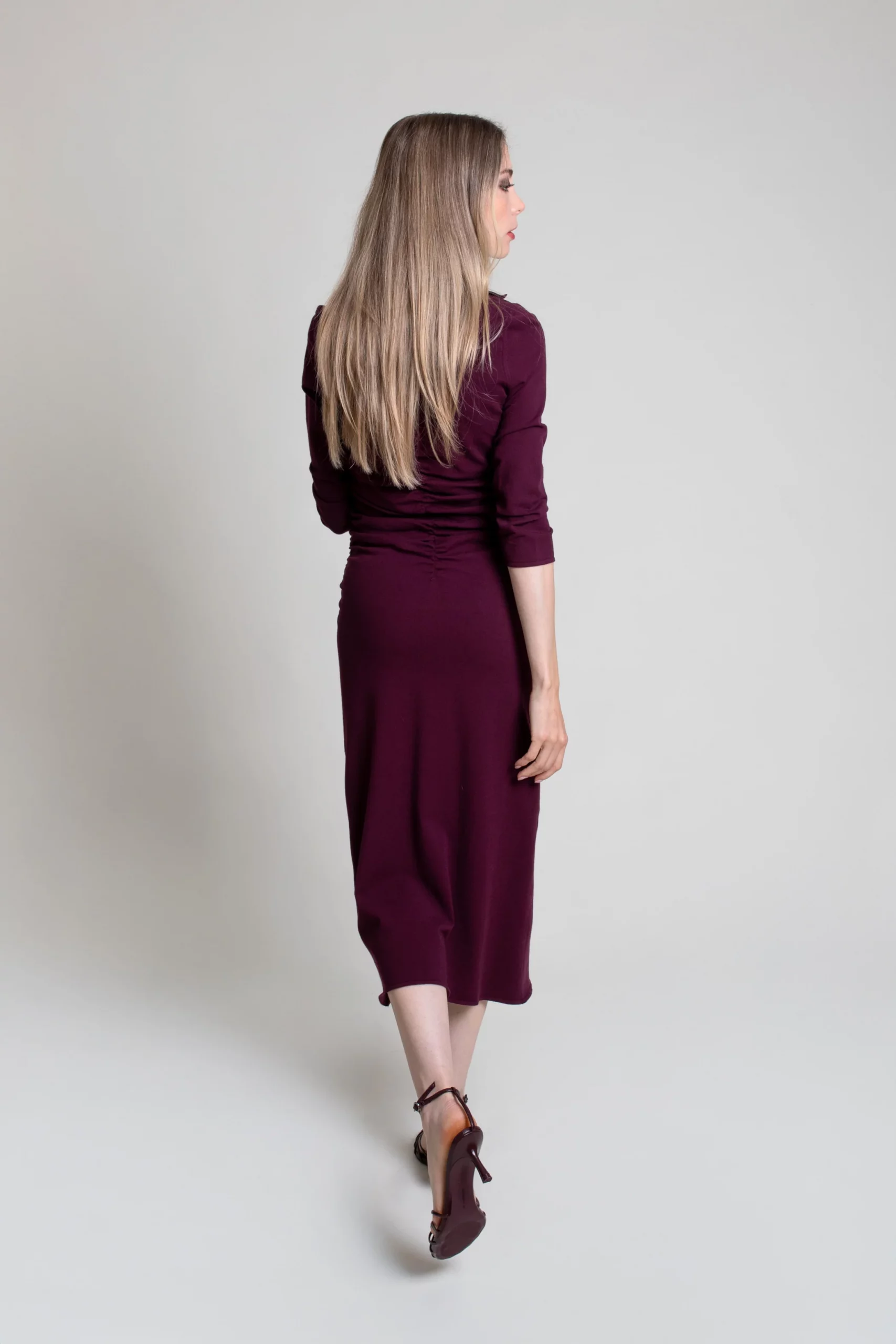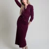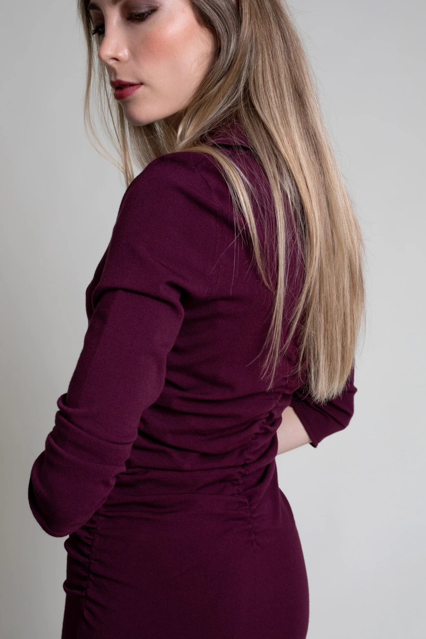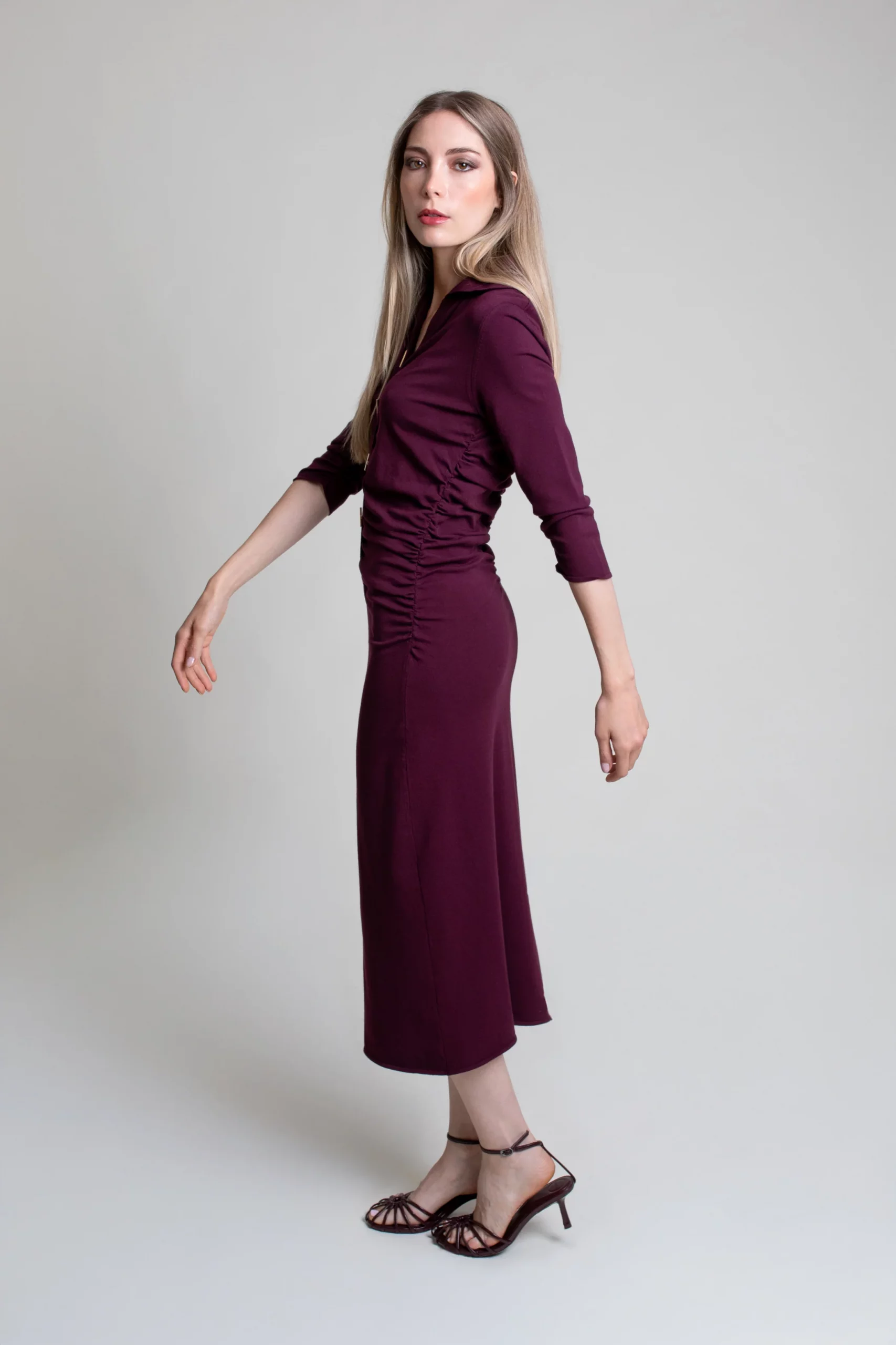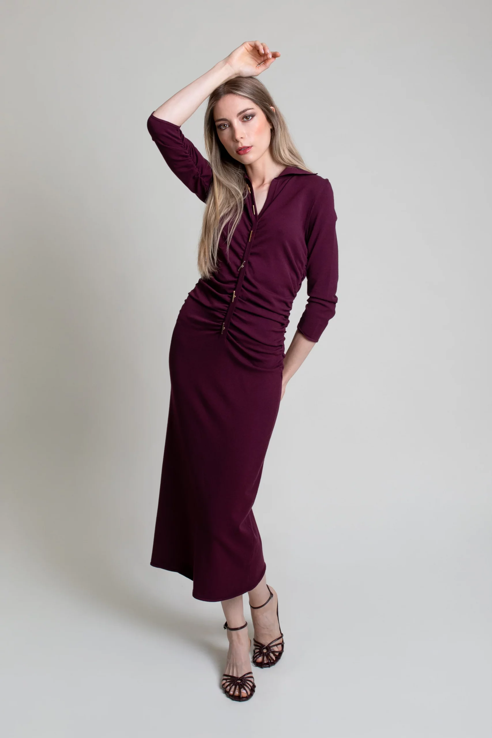 Vestido midi de punto tricot con manga larga y cuello camisero con escote pico. Modelo de corte ajustado con frunces y tapeta central con botones metálicos de adorno