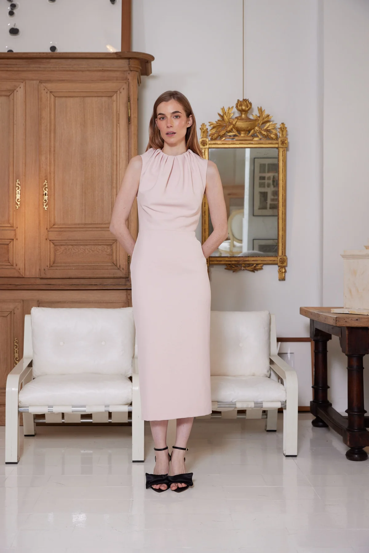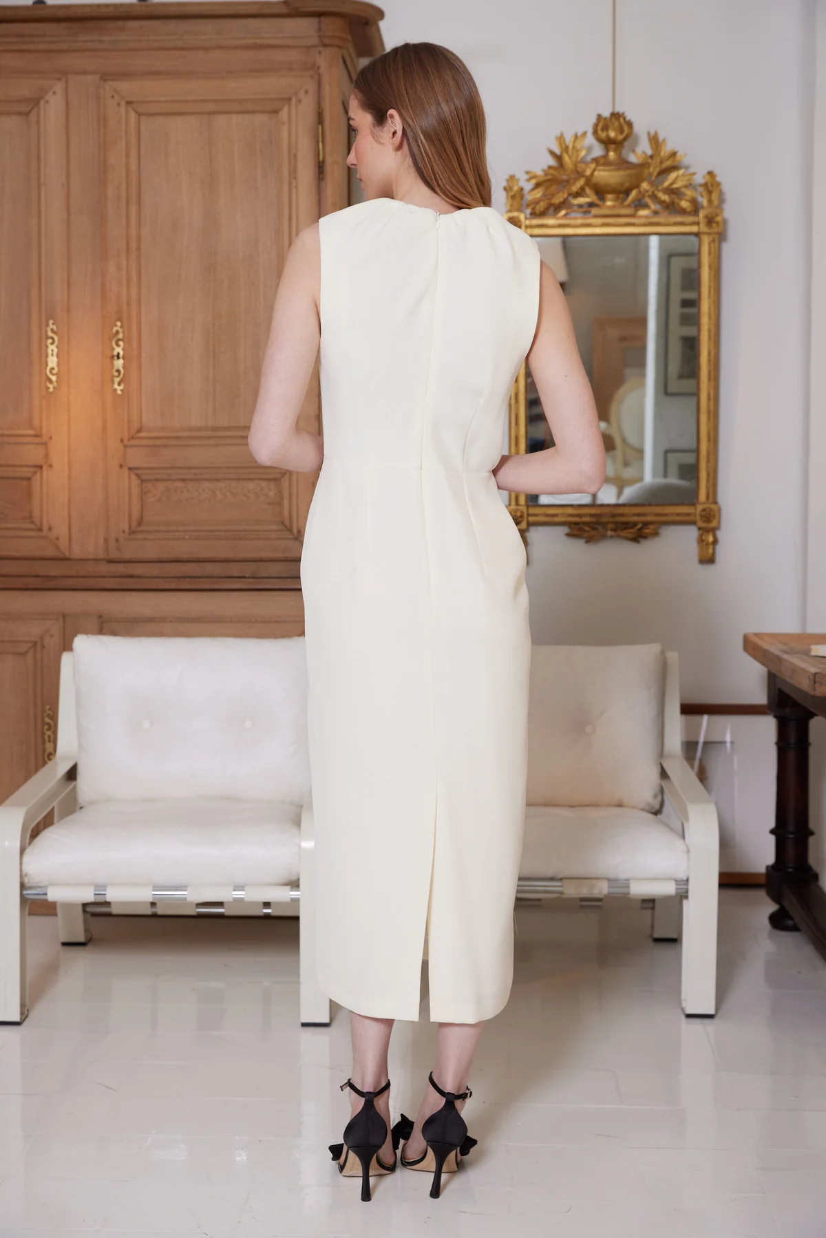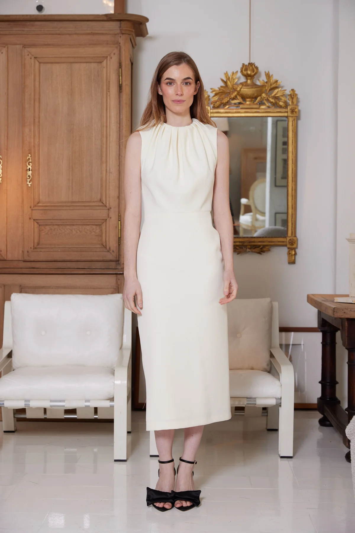 Sofisticación en su máxima expresión con este vestido midi de Coosy Studio, una pieza que redefine el lujo discreto con su diseño impecable y su silueta estructurada. Con un elegante cuello fruncido que aporta un sutil volumen, este vestido sin mangas resalta la figura con un corte limpio y refinado, inspirado en la costura de los años 50.