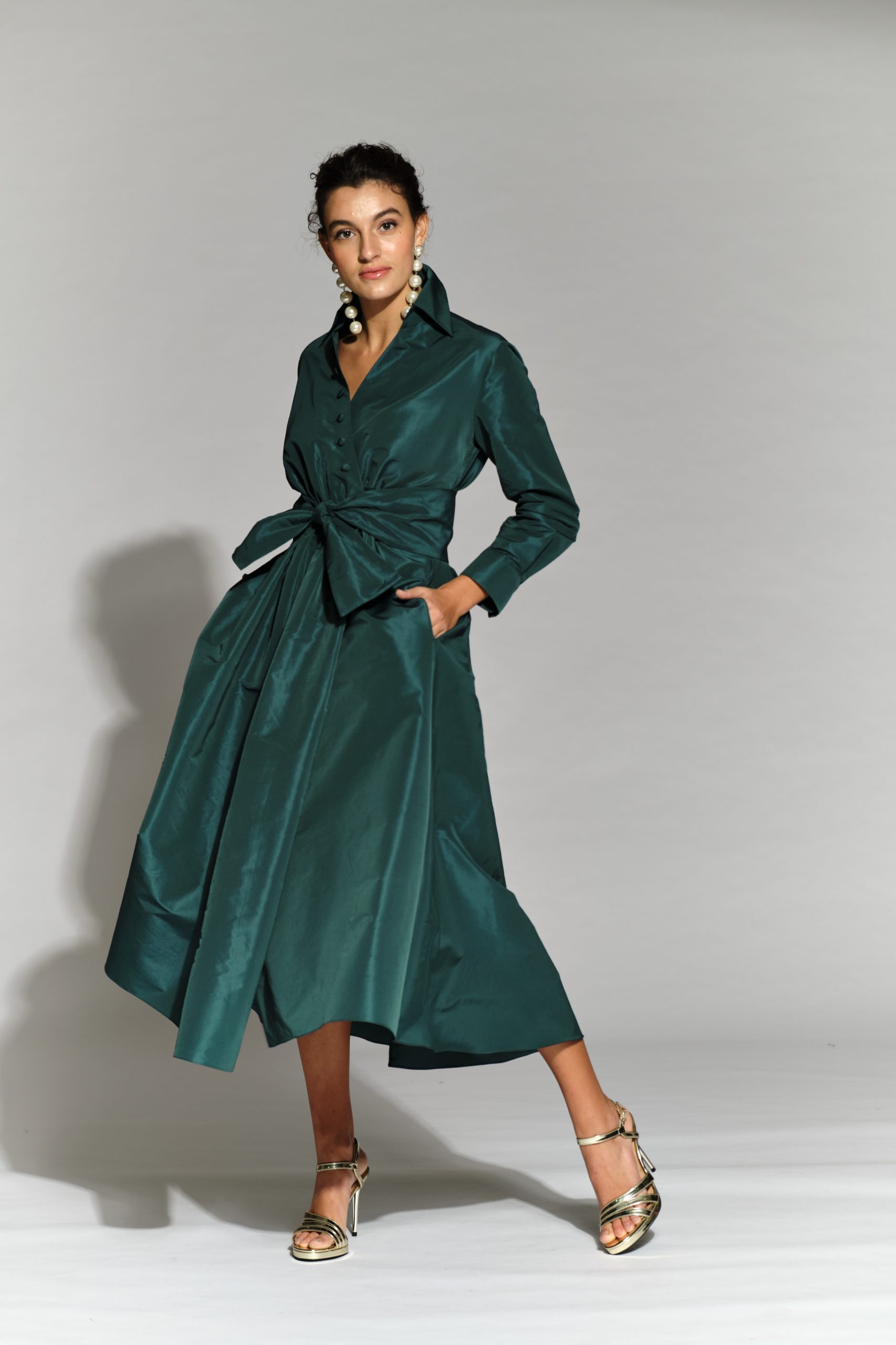 Vestido midi tafeta cruzado ribetado botones atado con lazo