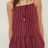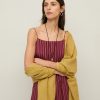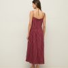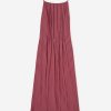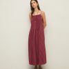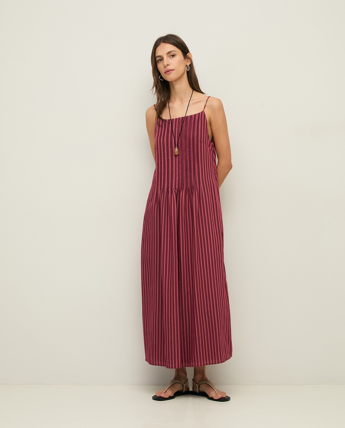 Vestido midi de tirantes finos y regulables. Elaborado en tejido mezcla de viscosa. Corte fluido y rayas verticales en tono burdeos y rosa. Escote recto. Cierre mediante cremallera trasera. Forro interior. Detalle de jaretas verticales. Bolsillos laterales. Longitud desde el hombro: 120 cm (talla S).