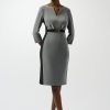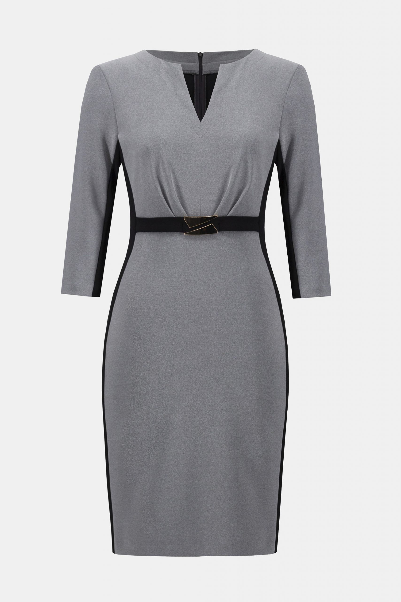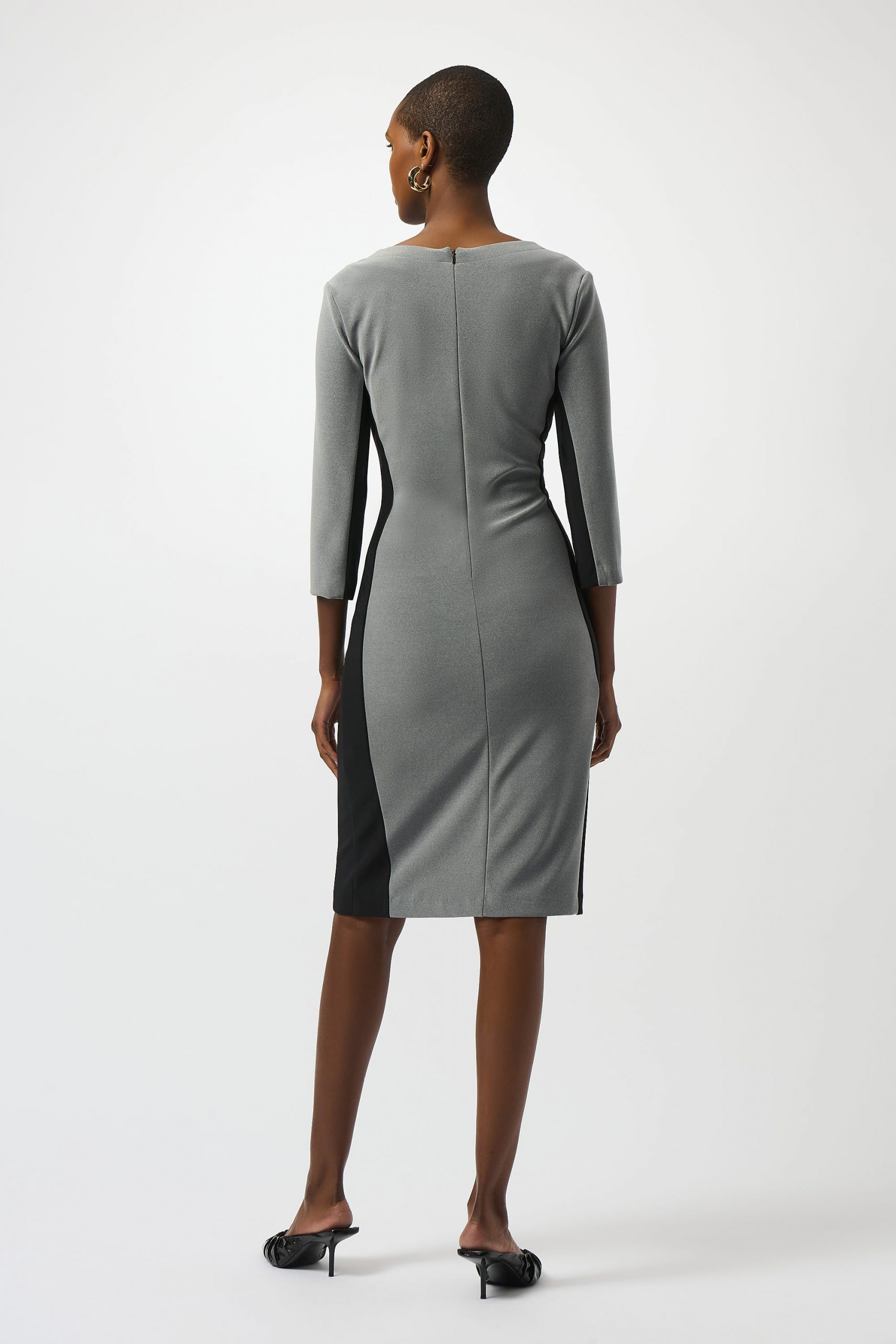 Este vestido en punto de seda melange ofrece un estilo sofisticado y atrevido con su favorecedora silueta de tubo. Las mangas tres cuartos y el escote con abertura contribuyen al aspecto refinado del diseño, mientras que los paneles laterales crean un contraste visual impactante. El cinturón delantero, que viene decorado con un delicado adorno, envuelve la cintura con gracia y realza el atractivo chic de la prenda.