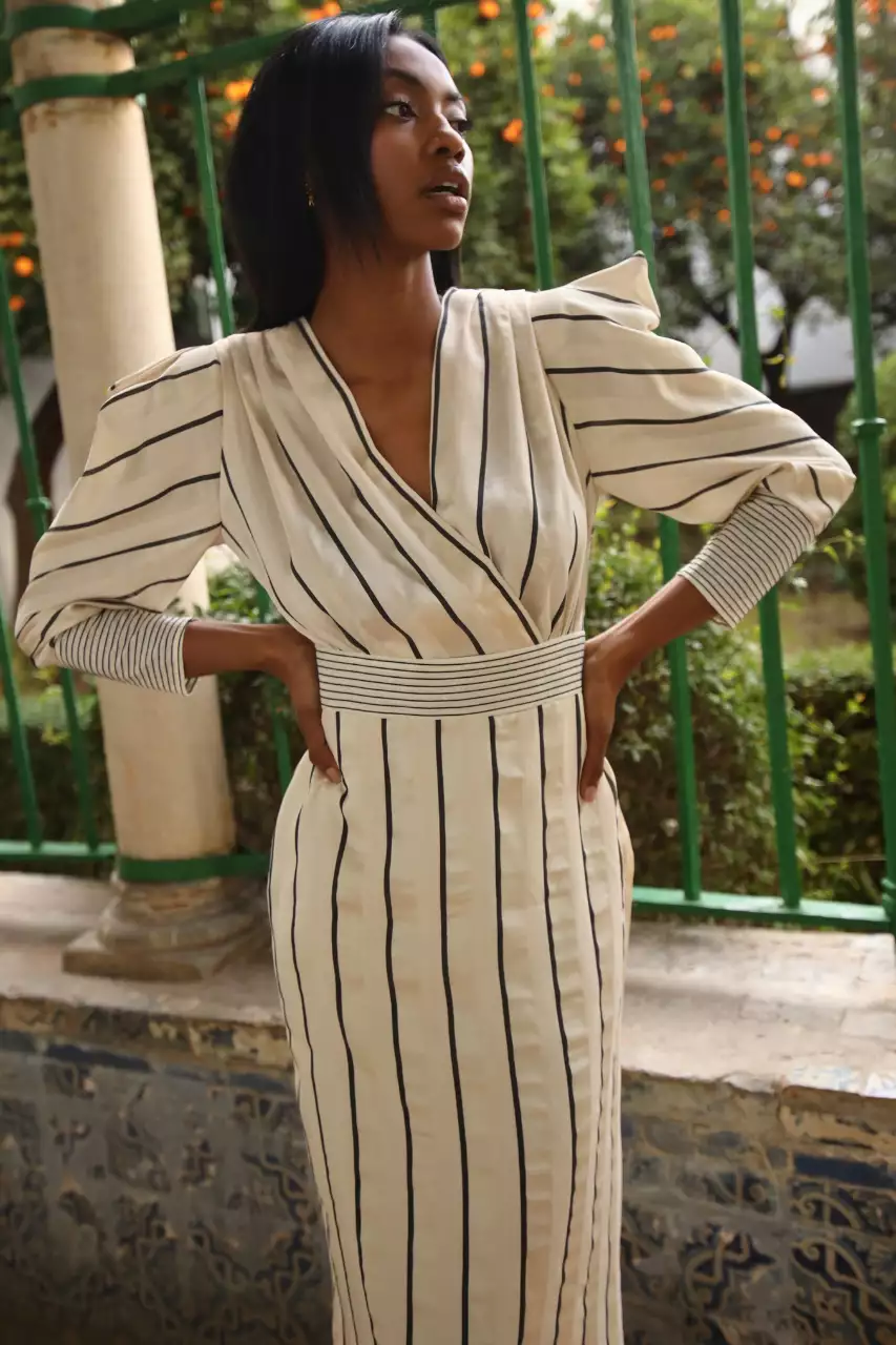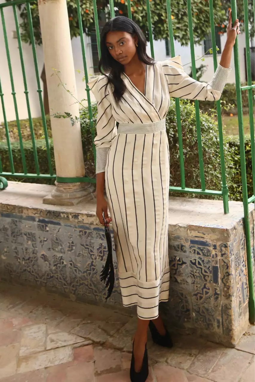 Vestido midi, mangas abullonadas que acaban en pico en los hombros. Escote en uve y cierre con cremallera invisible y botón en la parte posterior.