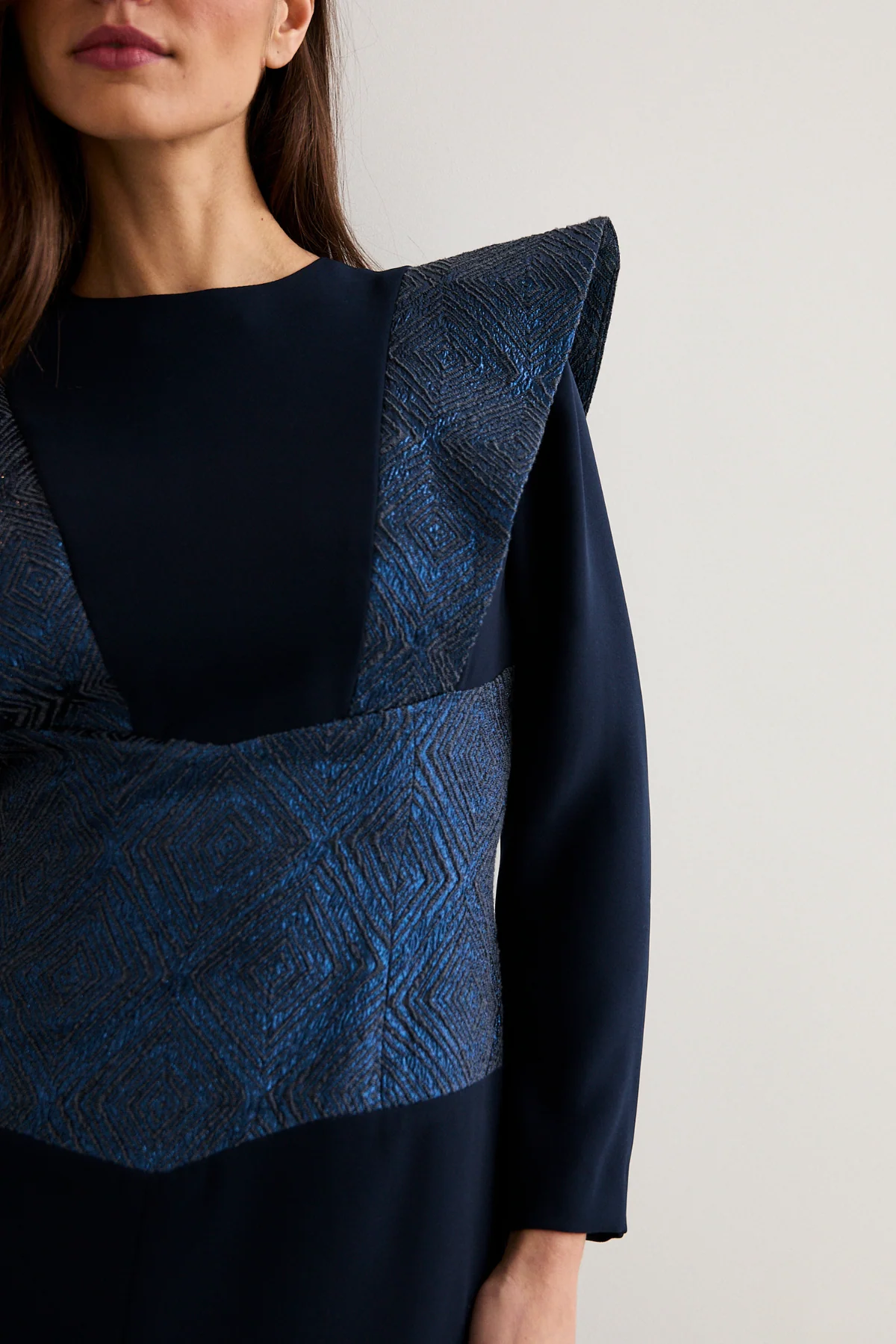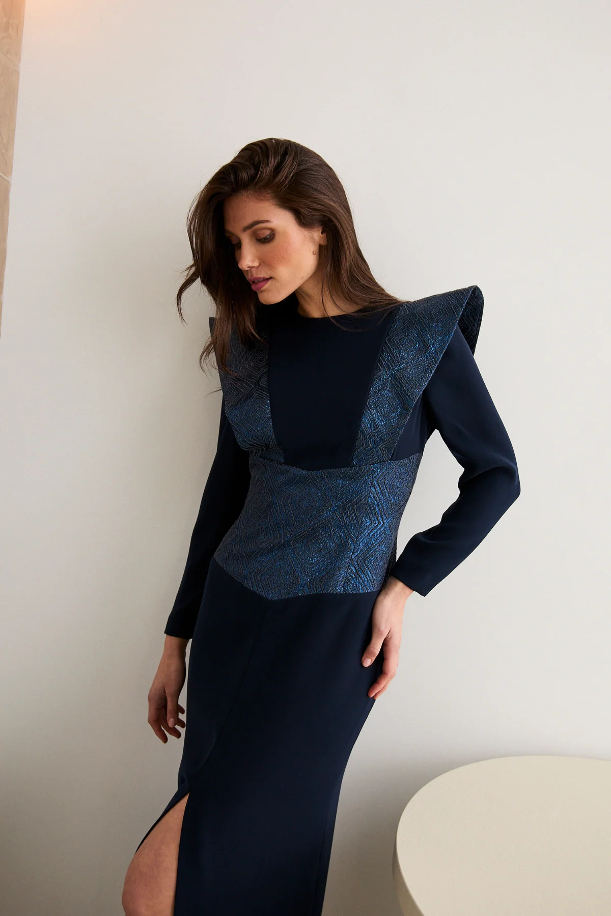 El cuerpo del vestido combina texturas: un elegante panel de jacquard geométrico en el busto y la cintura contrasta sutilmente con la suavidad del tejido liso, esculpiendo visualmente la silueta. La abertura frontal en la falda aporta un toque de sensualidad equilibrado con la sobriedad de las mangas largas.