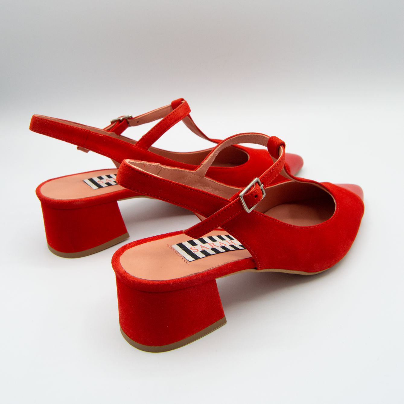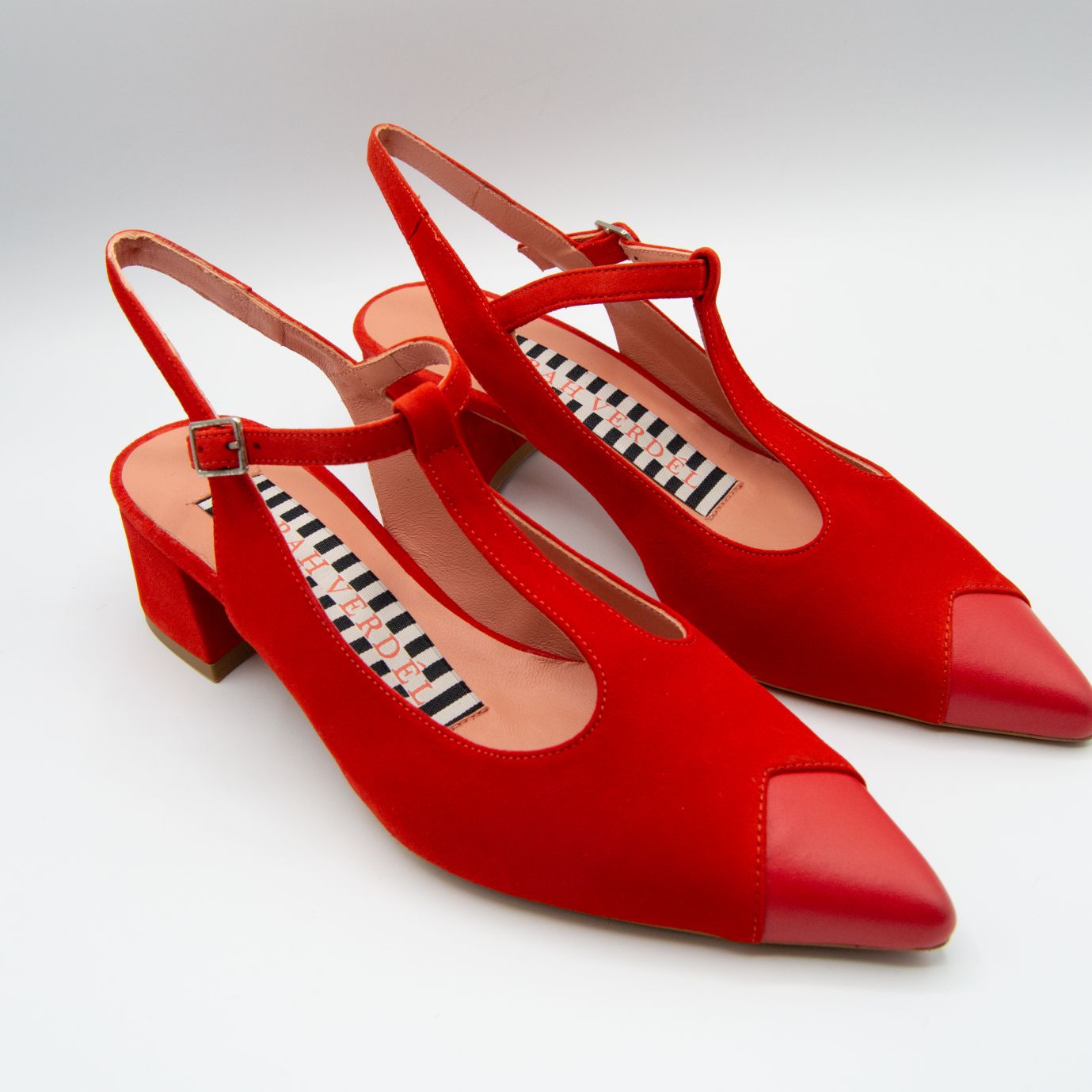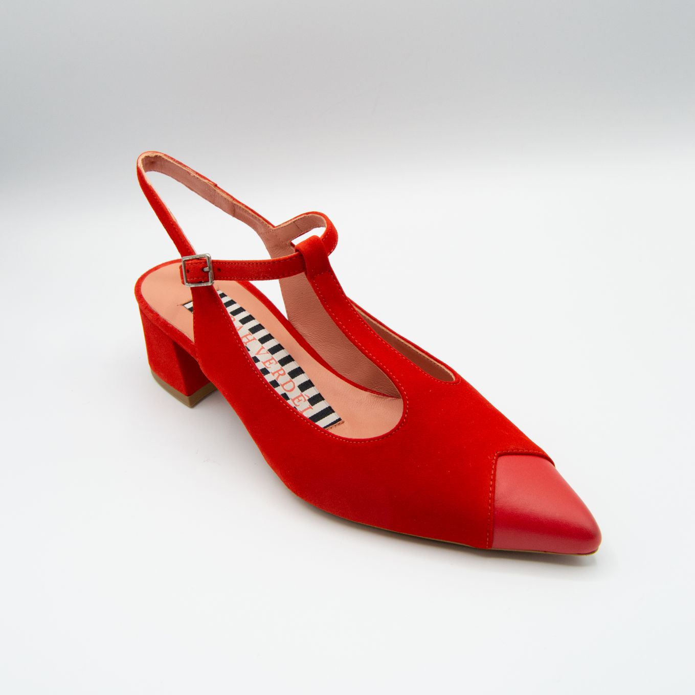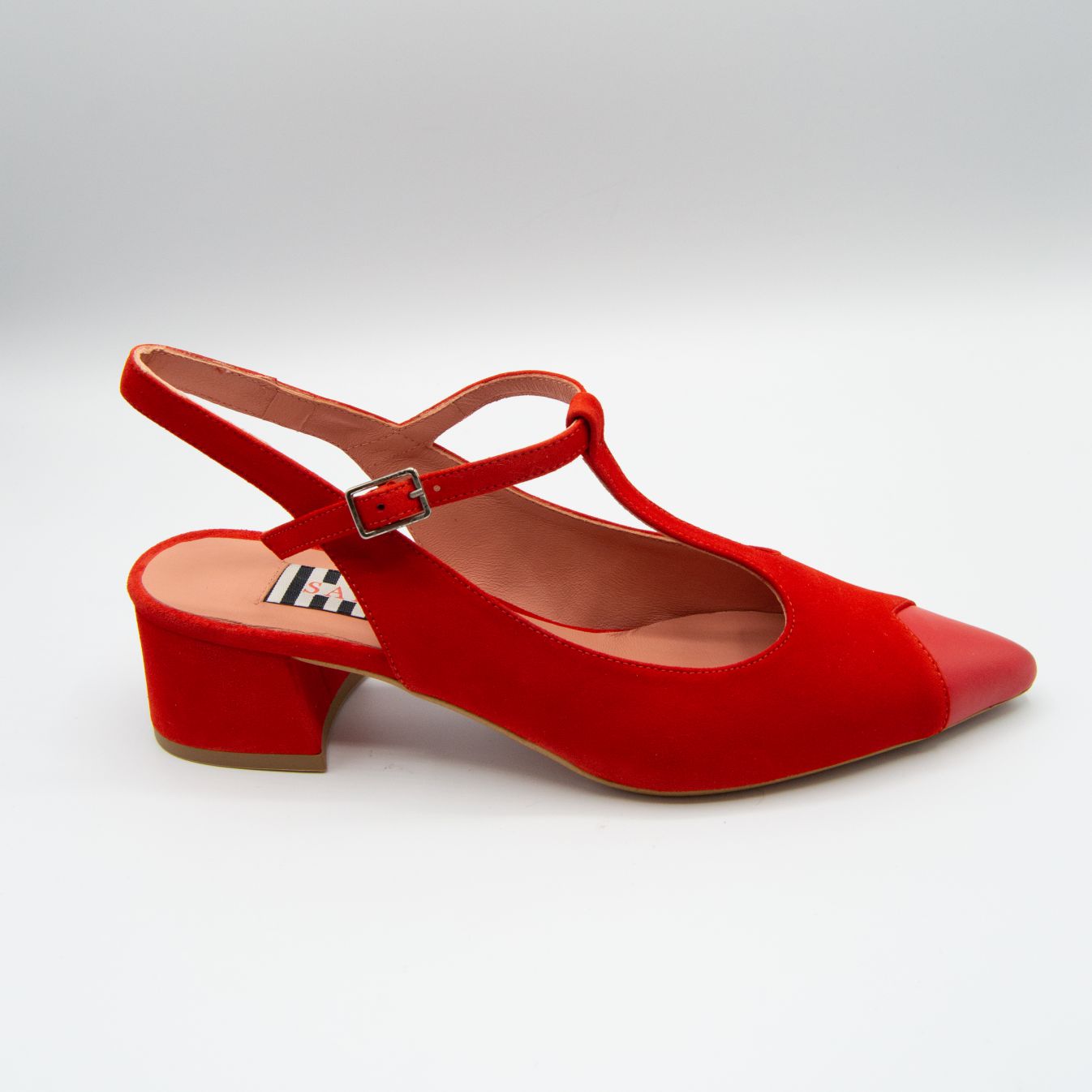 Zapato cerrado de piel acabado en ante, con punta contrastada en napa, al ir cerrado el pie va sujeto, tacón cuadrado de 5 cm de altura.